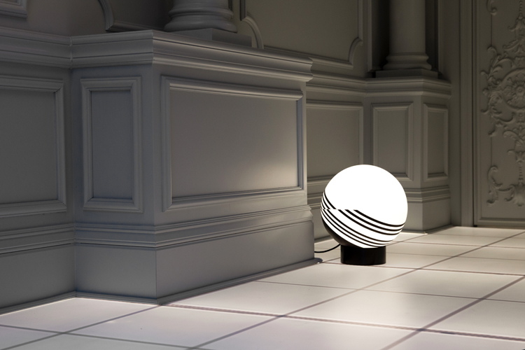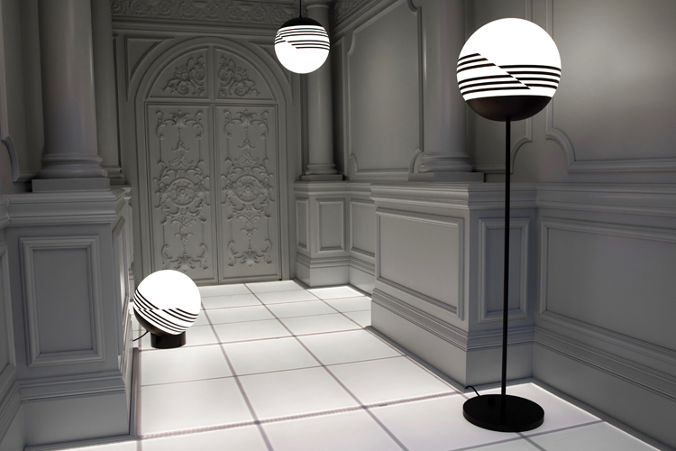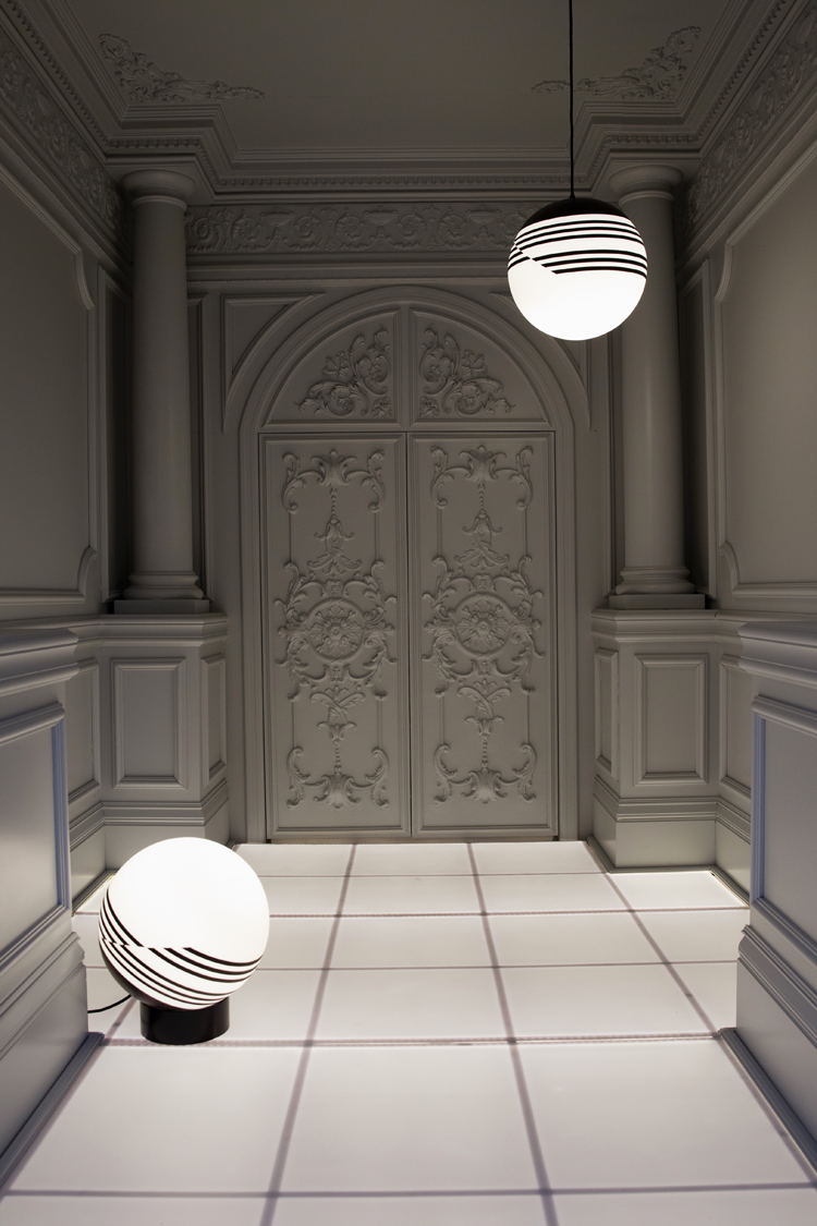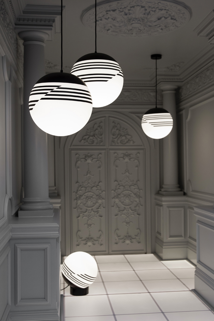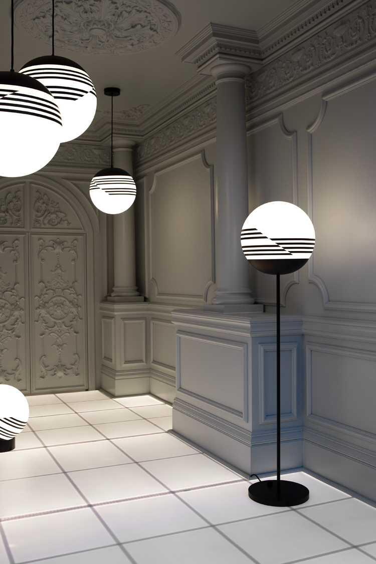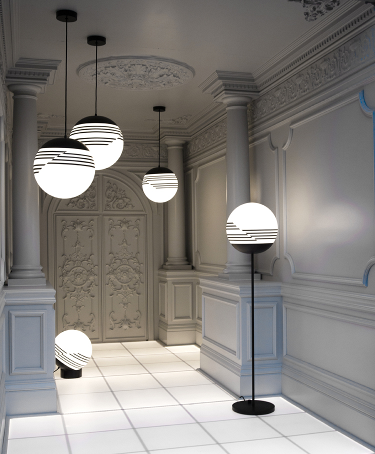 Dans cet espace existe une dualité entre le design contemporain et le design d’une autre époque. Le tout est illuminé de bas en haut grâce au sol. Cet espace est rythmé par une asymétrie et un décalage mis en avant grâce aux luminaires.