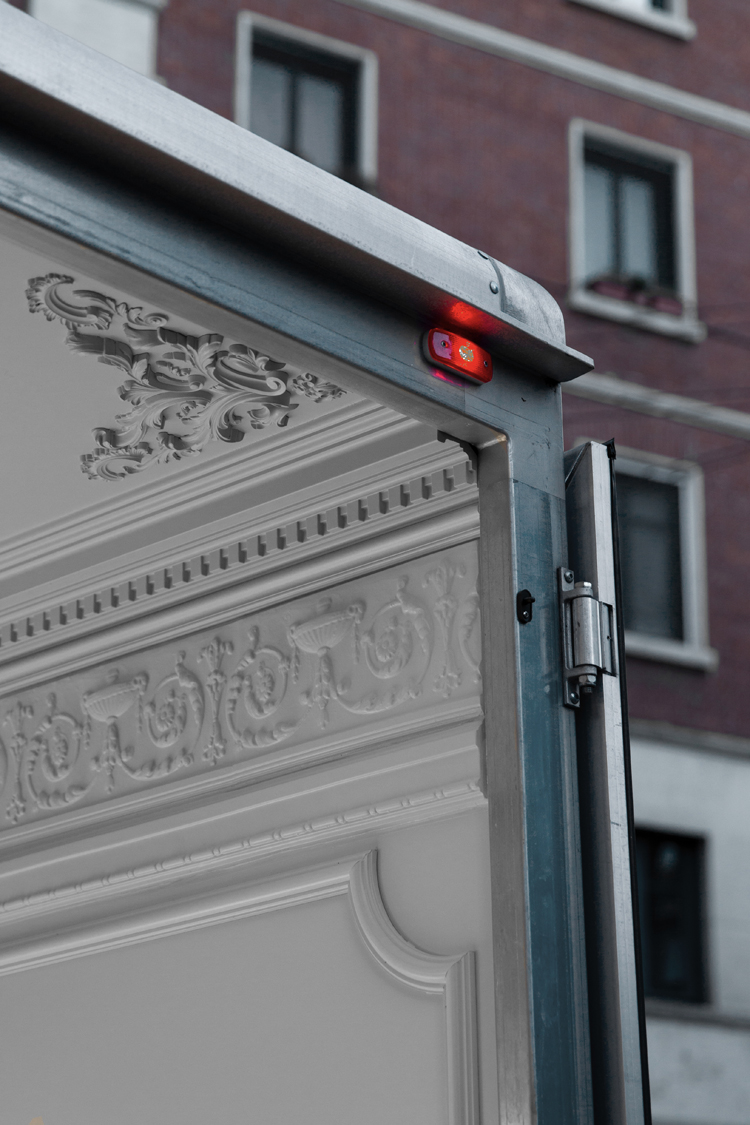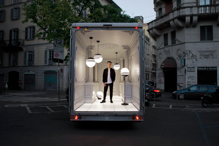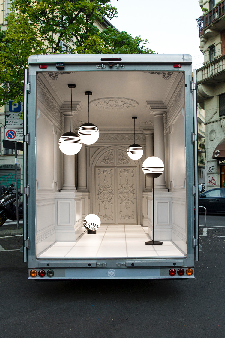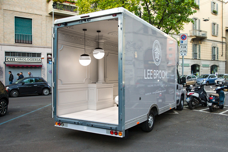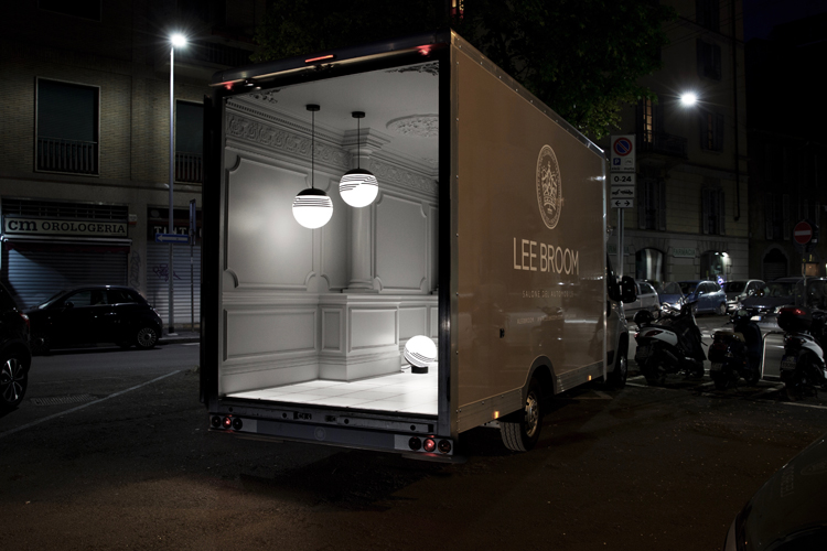 À l’ouverture des portes, le camion révèle un intérieur dramatique aux couleurs monochromes, signature de Lee Broom, où une récréation d’un décor italien traditionnel est représentée.