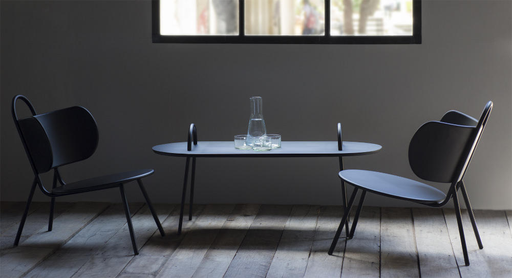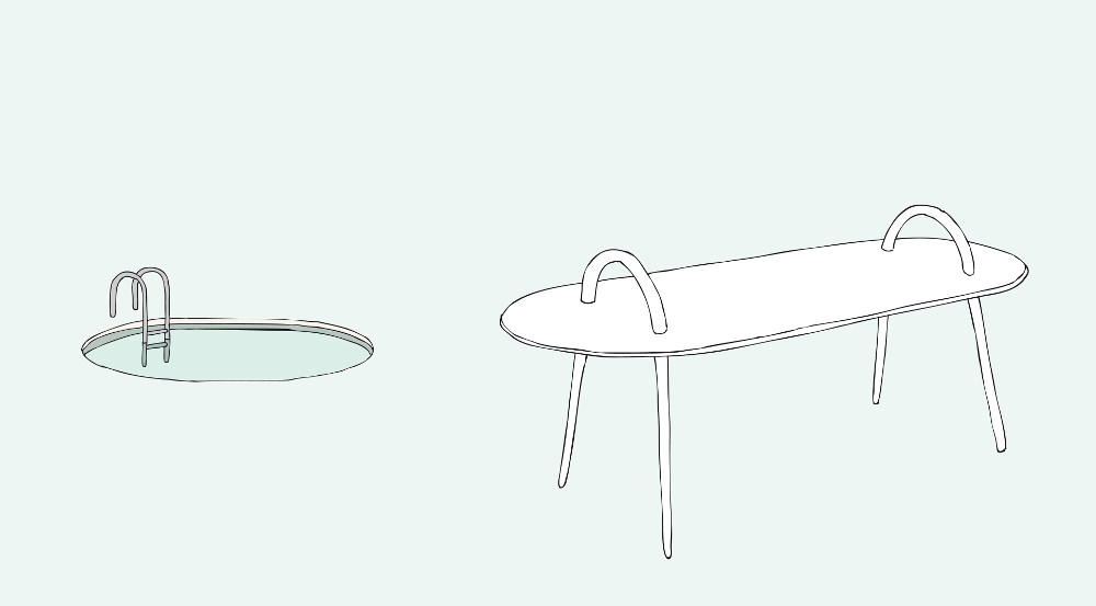 La collection SWIM regroupe une gamme d’assises, chaise et fauteuil, accompagnée d’une table basse. Les différents mobiliers comportent tous des anses pour pouvoir les transporter facilement, un peu à l’image des échelles que l’on trouve dans les piscines municipales.