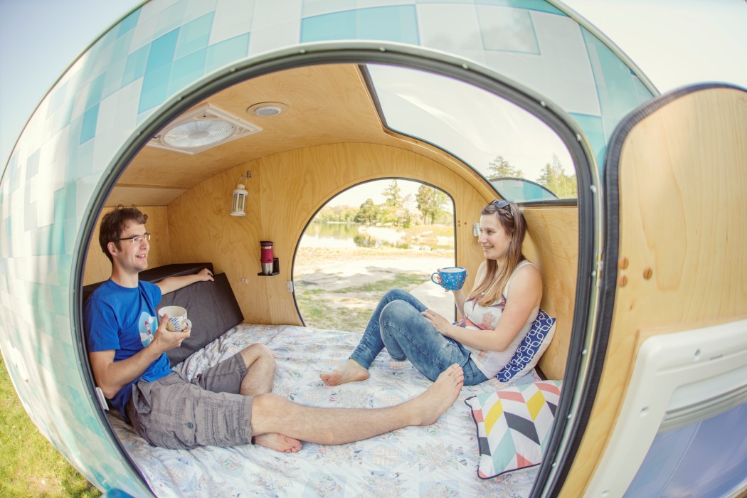 L’intérieur est aussi très spacieux. Prévu pour un couple ou une petite famille, il accueille un grand lit double ainsi qu’une table faisant office de divan. Sur le devant de la caravane se trouve une charmante petite fenêtre, encadrant le bleu de la nuit étoilée.
