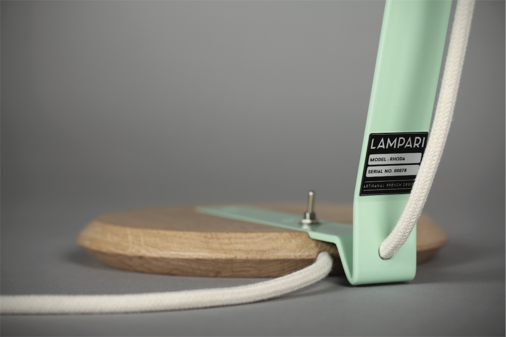 Jolie lampe aux aires du sud de la France, Rhoda TBL est produite à la main dans les ateliers marseillais de la jeune marque Lampari. Le socle fabriqué en chêne brut ciselé, retient un pied en acier. Grâce à un ingénieux pliage, le portant fait également office de passe-câble.