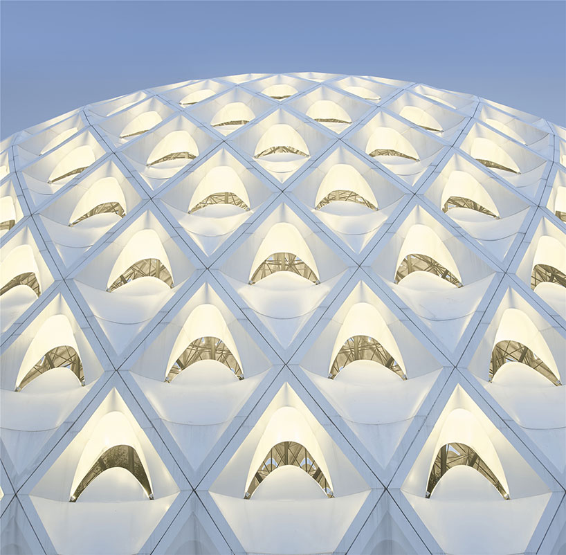 Au lieu de se cantonner à imiter les symboles islamiques traditionnels, l’architecte traduit les motifs dans une interprétation géométrique modernisée. Le dôme par exemple utilise des coquilles pétaloïdes qui permettent à la lumière du jour de pénétrer et de remplir l’intérieur d’ombres complexes.