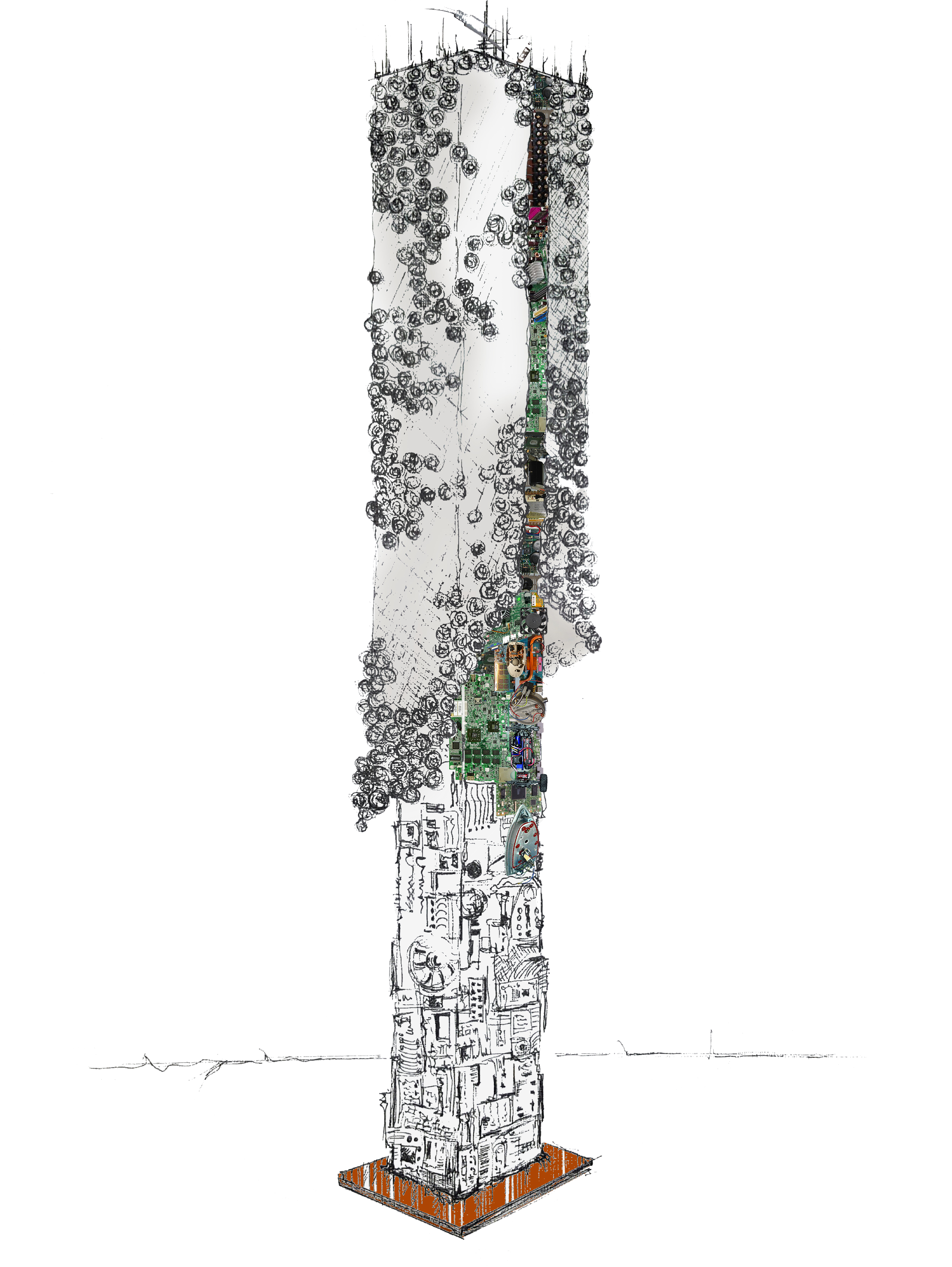 La naissance de l’Objet en Totem est issue d’un pont entre le recyclage et la reconversion esthétique. Sous un abat-jour en forme d’étole nonchalante, faite de perles de chutes de cuir entrelacées, s’élève un Totem … Un totem en assemblage d’objets uniques ou usuels, toujours hétéroclites, nés de l’art de la trouvaille. Une lumière décor pour combattre l’obsolescence programmée: nom donné par abus de langage à l’ensemble des techniques visant à réduire la durée de vie ou d’utilisation d’un produit afin d’en augmenter le taux de remplacement.