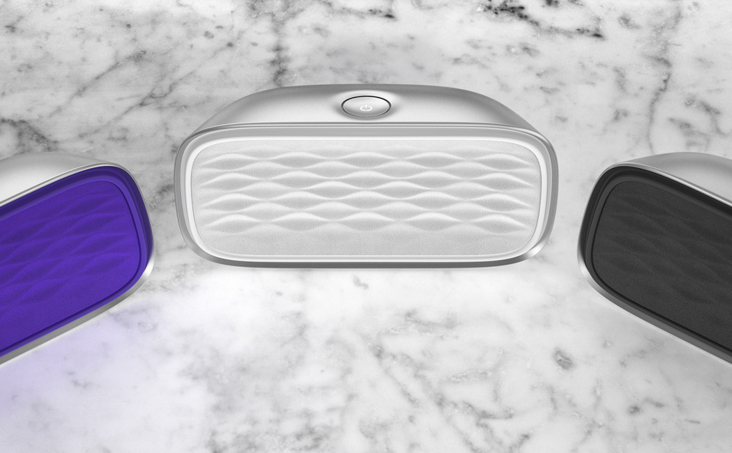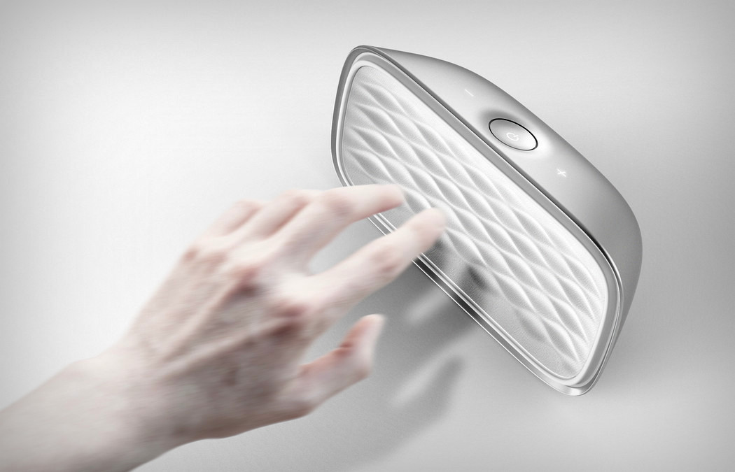 Evoke est une enceinte acoustique sans fil. De plus, elle a la particularité d’être imprégnée d’une esthétique épurée et futuriste. Cependant, la fonctionnalité reste le vecteur principal de l’objet. Les angles légèrement inclinés lui permettent de transmettre le son de manière efficace à l’utilisateur. Le contrôle du volume est visible uniquement lorsque l’on saisit l’enceinte. En effet, des lumières blanches en LED sont cachées sous de nombreux trous de taille microscopique discrètement placés au dessus du haut-parleur.