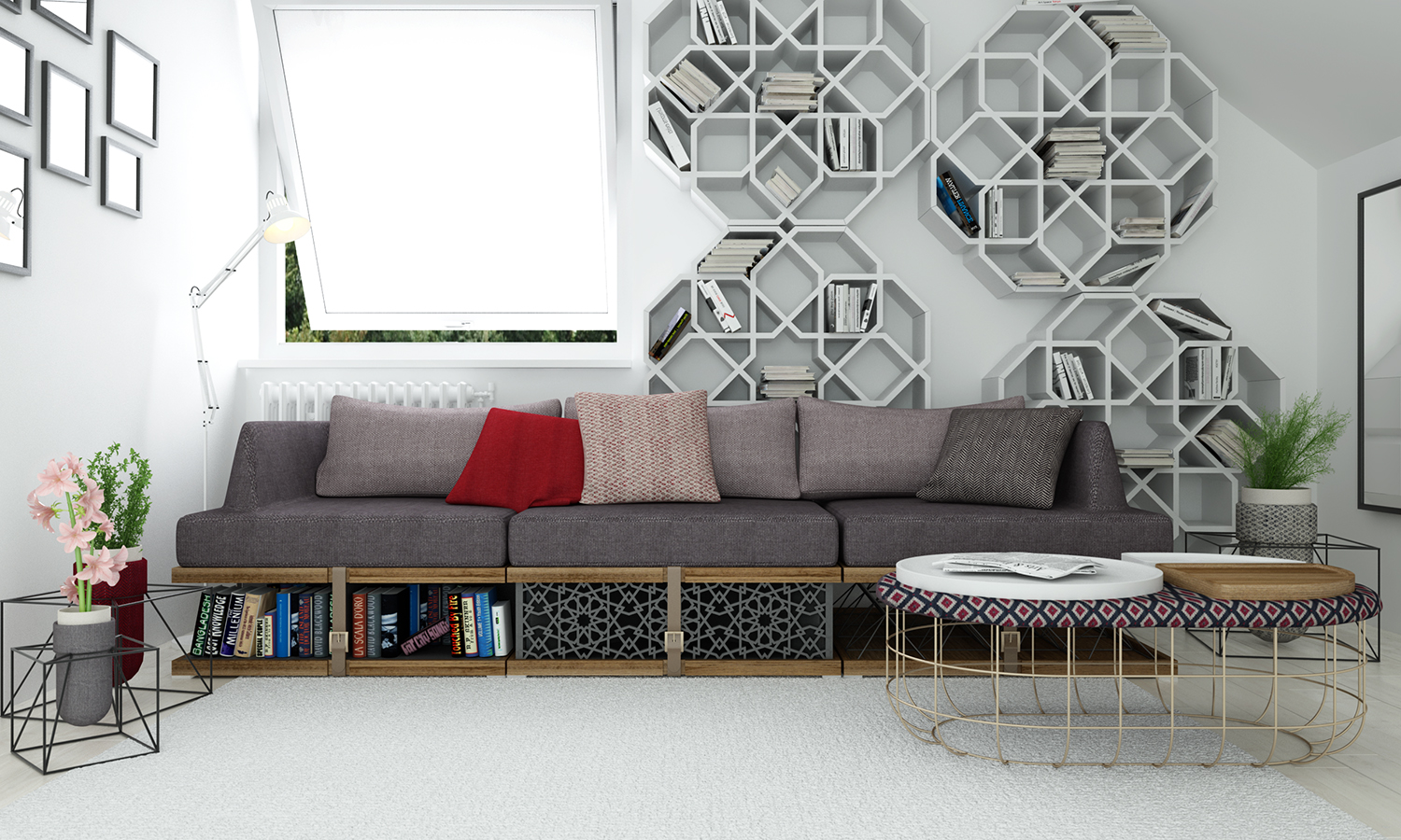 La table basse Sghrira est une preuve que la fonctionnalité peut être développée là où on ne l’attend, mais pas seulement… De surcroît Sghrira est un meuble graphique, où motifs et lignes se mêlent. Le piétement métallique aérien vient soutenir la table tout en dégageant la vue. Le plateau coussin vient contraster avec son motif et ses couleurs chatoyantes. Sur ce même plateau viennent se loger les trois éléments amovibles. Ces derniers se logent dans des empreintes invisibles. Les possibilités offertes par ces éléments dissociés les uns des autres invitent au dynamisme. En effet qu’il soit question de lire, de déguster un café, ou bien de prendre l’apéritif… Sghrira se plie à tous les désirs. Si une envie se fait sentir il suffit juste de choisir le plateau adapté à ses besoins. Sghrira nous parle de mouvement et d’adaptabilité et le tout avec harmonie. De plus, ses fonctions ne s’arrêtent pas là puisque la table basse se convertit en footstool ou en siège d’appoint.
