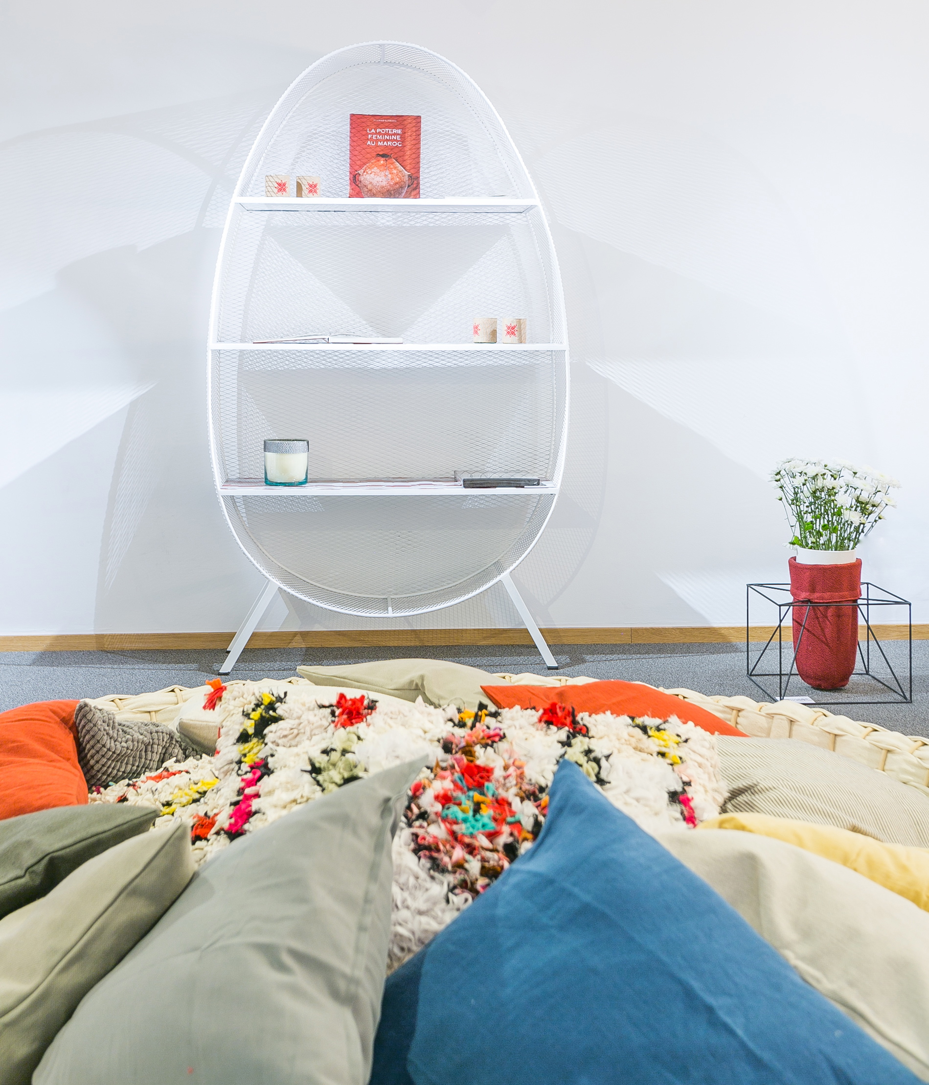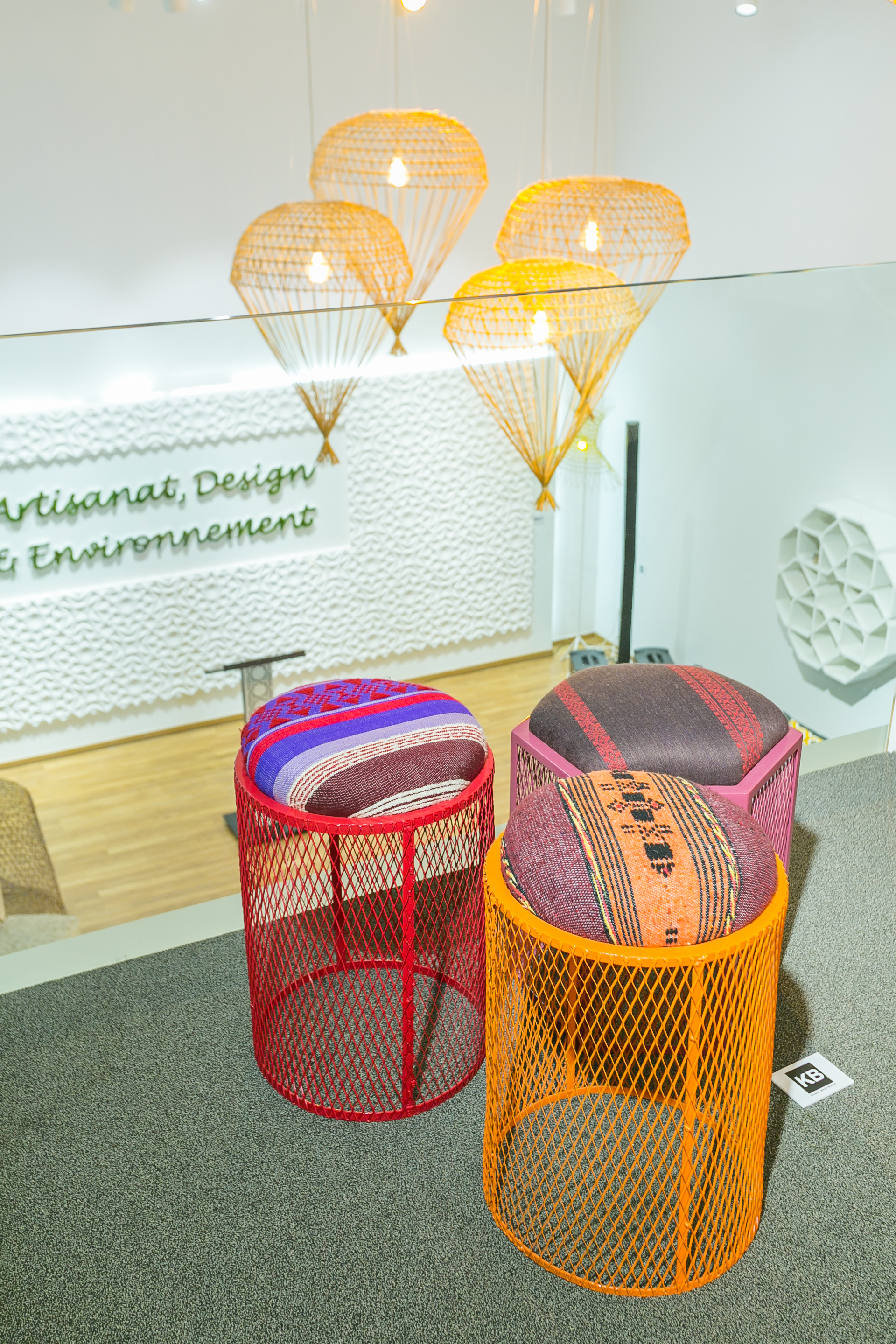 Son travail exposé à la Galerie H est aussi parlant que vivant. La référence à la nasse est évidente sans pourtant tomber dans la redondance. En effet, qu’il soit question de luminaire ou d’étagère, la notion de l’entrelacement diffère. Du reste, la forme générale de la nasse est perceptible dans la silhouette de cette dernière. Khalid El Bastrioui a conçu des objets tout en finesse en jouant sur les anecdotes. Les luminaires tournoient au-dessus des têtes tels des parachutes tressés arrêtés en pleine descente. Dans un autre registre, sa table basse mêle céramique et métal. Comparable aux tabourets, l’aspect grillagé fait le lien avec la nasse. Ainsi, chaque objet est une référence à la nasse tout en représentant une nouvelle prise de risque. Khalid El Bastrioui pousse les limites, explore et teste. Finalement, c’est aussi par cette volonté de dépasser l’existant que ses projets tirent leur force.