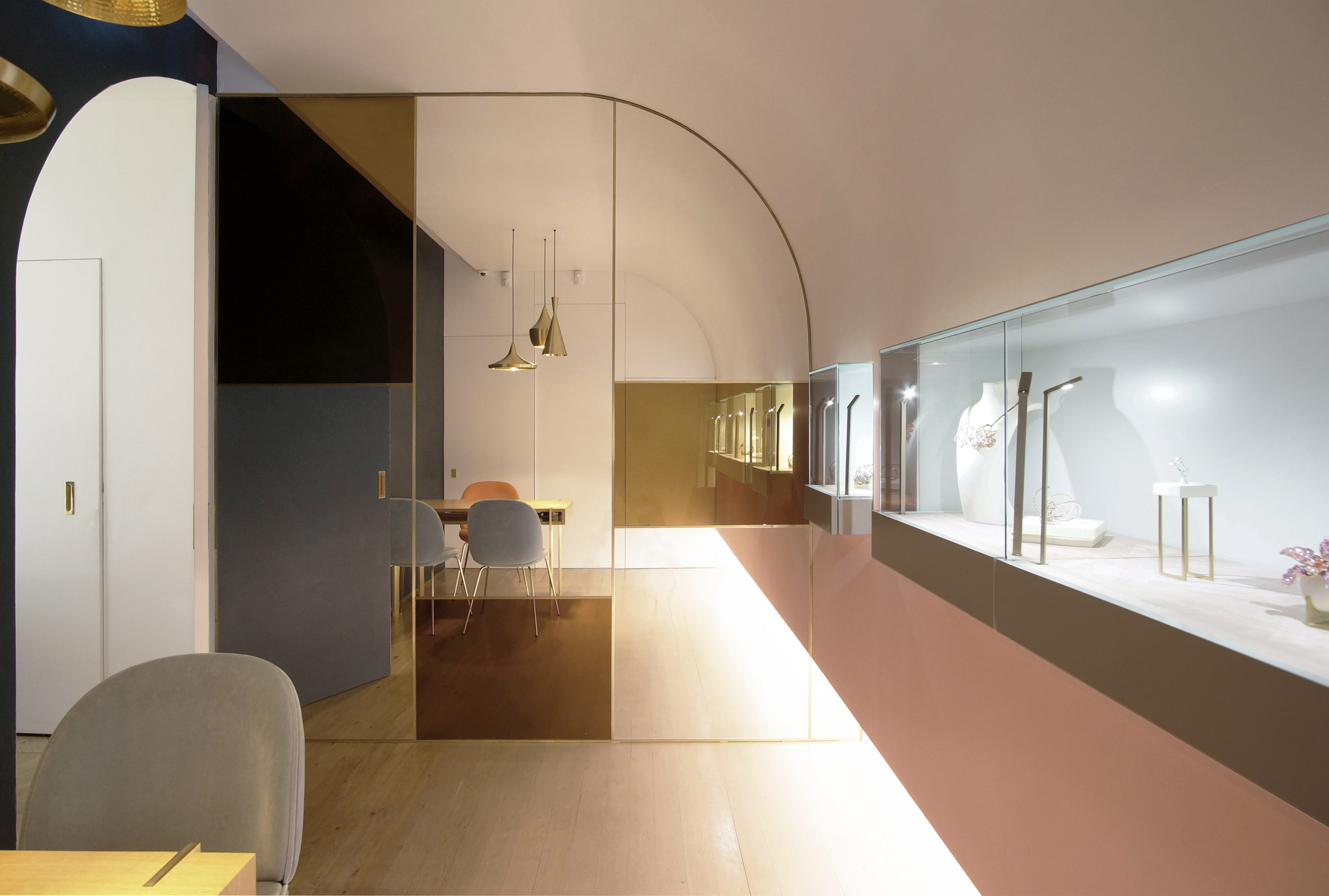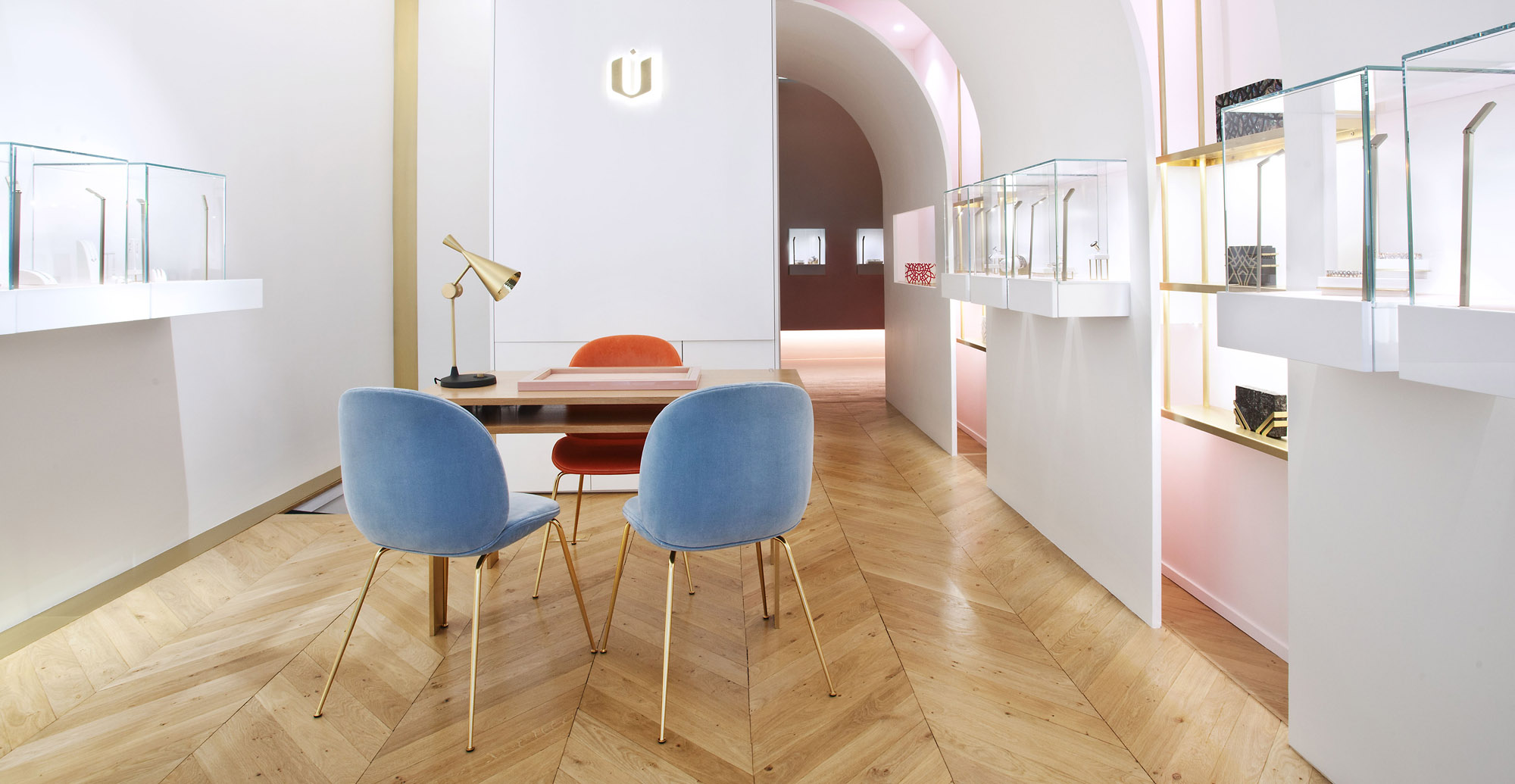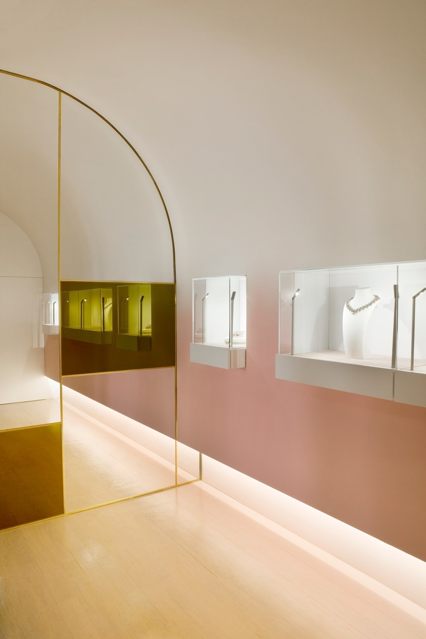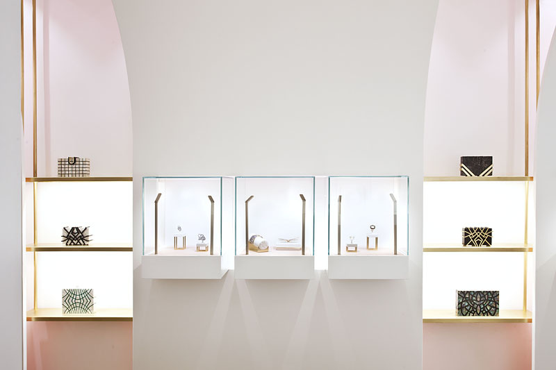 Ensemble l’Atelier Brunoir et Java Architectes créent une boutique écrin qui mêle les inspirations du moyen Orient et du luxe parisien. Loin du clinquant, ils se sont approprié le projet afin de correspondre aux commanditaires et de mettre en valeur les bijoux présents. Ils développent ainsi un jeu de courbes, de miroirs et de lumières indirectes délicatement colorées. L’espace général est épuré, empreint d’un luxe distingué tout en respectant les codes de la marque composés de blanc, de rose poudré et d’or.