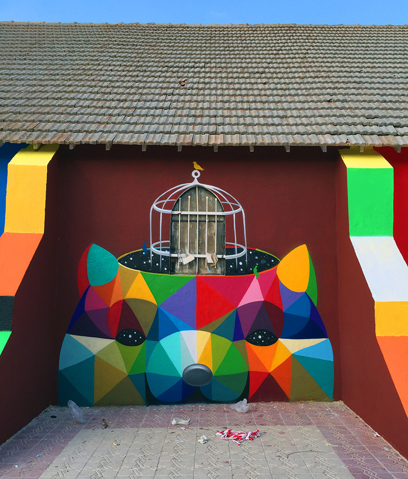 L’artiste espagnol Okuda San Miguel aime traiter avec des endroits abandonnés. En effet, il leur redonne vie par le biais de couleurs chatoyantes. Okuda à le talent de faire renaître un lieu abîmé par le temps. Or la couleur ne vient pas comme un ajout mais constitue motifs, illustrations et personnages. L’explosion de nuances colorées redonne vie à n’importe quelle battisse. Teintes vives et motifs géométriques font du travail d’Okuda une réelle signature. En 2015 il avait notamment repeint une église espagnole. Le résultat était surprenant car le lieu prenait des airs de kaléidoscope coloré. La couleur donne de la force, de la joie et de la bonne humeur à des lieux qui en étaient dépourvus depuis des années.
