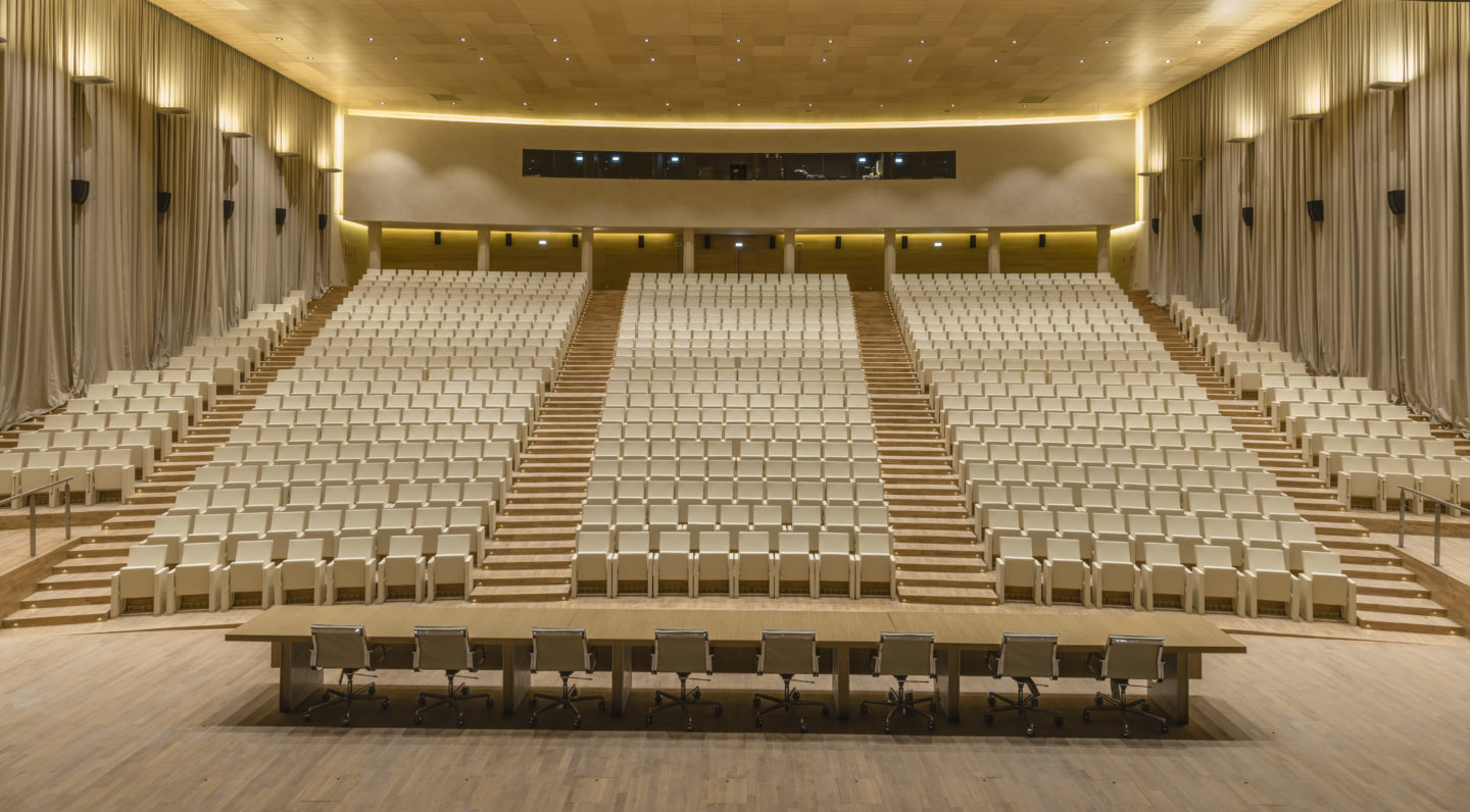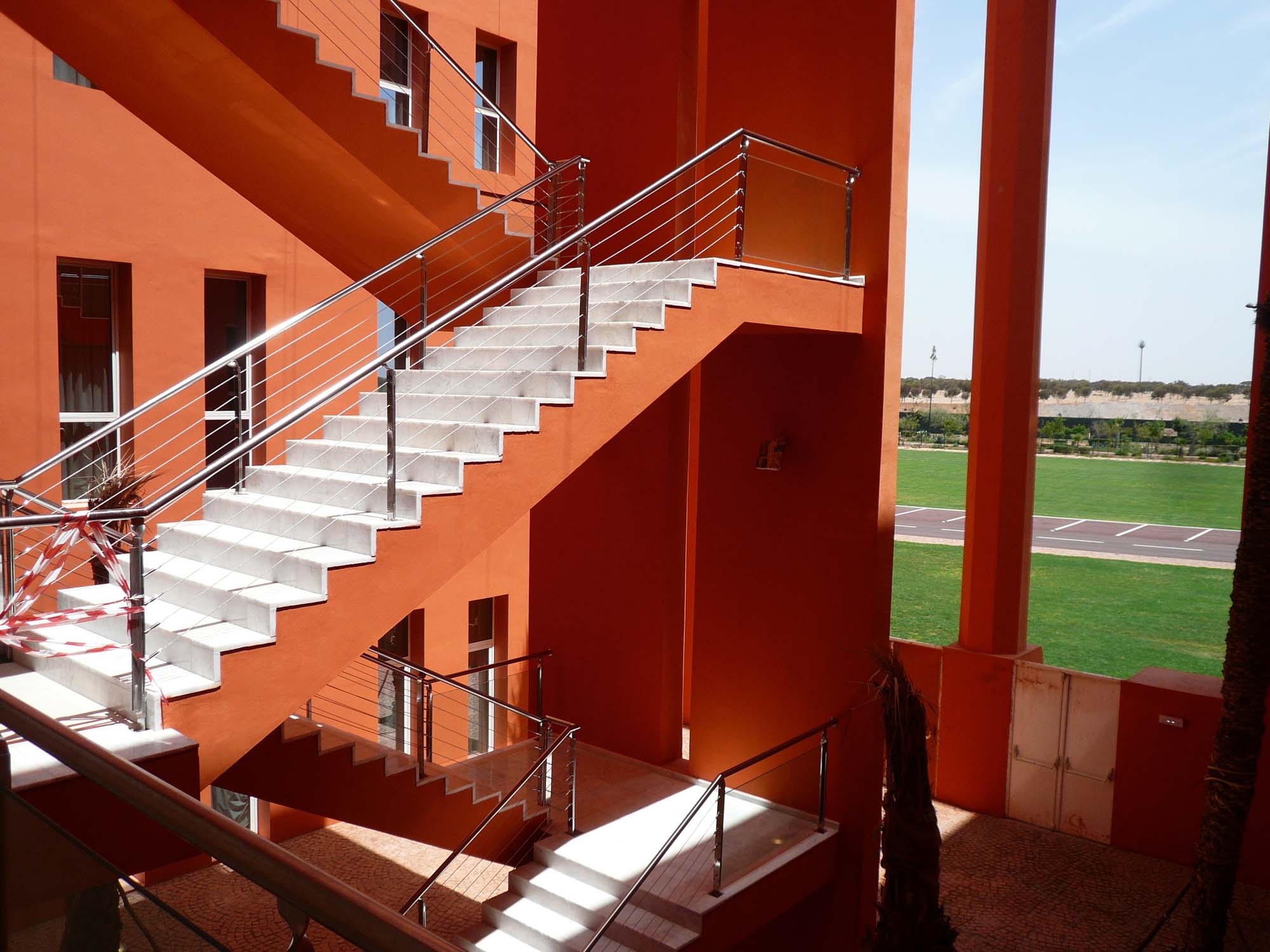 L’ architecte Ricardo Bofill Taller en collaboration avec l’architecte d’origine Marrakchie Elie Mouyal ont travaillé sur la conception de la nouvelle université Mohammed VI située dans la ville de Ben Guerir, petite ville limitrophe à Marrakech. L’établissement couvre 55 hectares et le complexe fait 300 000 m2. Ce projet colossal met en œuvre un design urbain pensé pour les étudiants et les enseignants. Cependant il fallait respecter un contrainte: aucune structure ne pouvait dépasser 21 mètres de haut. C’est en partant de la forme carré que l’établissement s’est construit. Plan et élévations partent ainsi d’une forme commune. Le campus est orienté vers une culture piétonne avec des espaces conçus pour les rassemblements. Une promenade centrale divise le site en tant qu’épine dorsale du projet, bordé de boutiques, de salles de classe et d’espaces publics. Cette organisation favorise ainsi les échanges intellectuels et sociaux en renforçant le sens de la communauté.