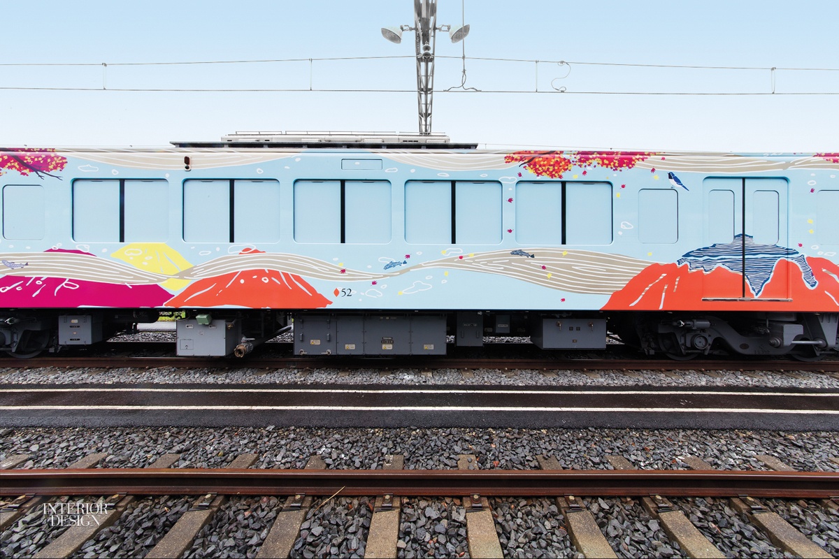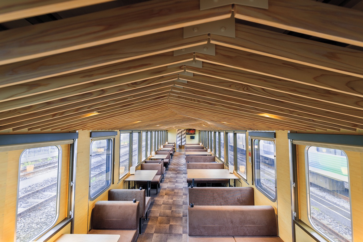 Kengo Kuma accorde une attention particulière aux plafonds des voitures, chacun est unique. Les lattes de cèdre localisées se rencontrent de manière différentes sous chaque plafond. Un autre est décoré avec du papier peint teinté puis collé sur une sous-structure en aluminium.