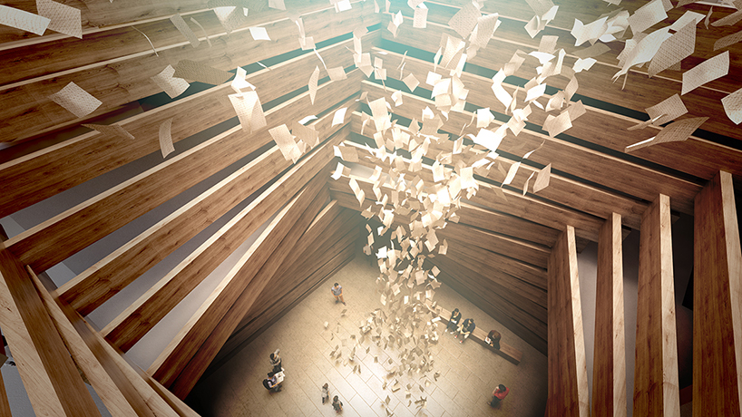 La nature empilée des volumes semble augmenter la hauteur du bâtiment. De plus, le programme offrira des opportunités pour les travaux d’art à grande échelle et donc d’installation artistique. Cependant, à l’étage, les volumes plus petits accueilleront des œuvres d’art plus intimes. Enfin, l’atrium central, composé de blocs de bois, fournit la circulation à chaque niveau. Ajoutons à cela la lumière naturelle qui s’invite par la grande lucarne et inonde le volume entier.