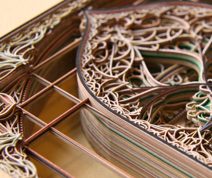 Le système de fabrication est ingénieux. En effet, les dessins sont créés à l’aide de CorelDraw et coupés sur un laser CNC ULS. Or, chaque couche de papier est dessinée et coupée individuellement. Ses compositions sont déterminées consciemment en enlevant le matériau de chaque feuille de papier, et en pré-visualisant la somme des couches sous forme de ligne, de couleur et d’espace.