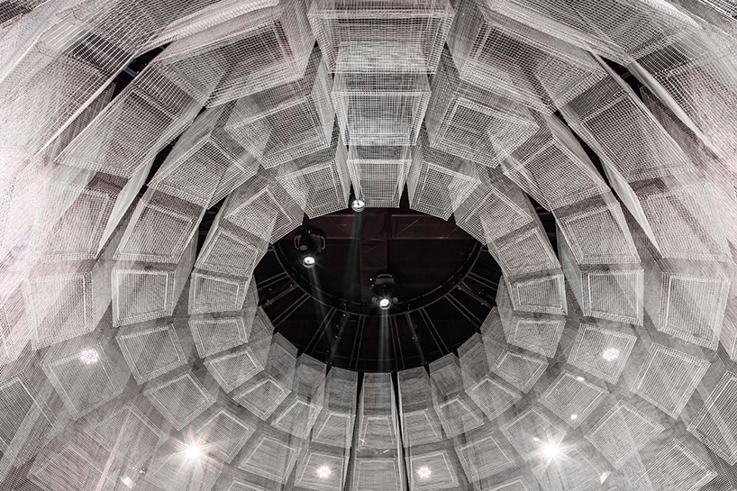 En utilisant un treillis métallique transparent – son matériel de signature – le sculpteur italien a construit des éléments à la fois colossaux et aériens. En effet, colonnes, arches et dômes se mêlent aux arbres et aux plantes parsemées tout autour de l’espace des événements.