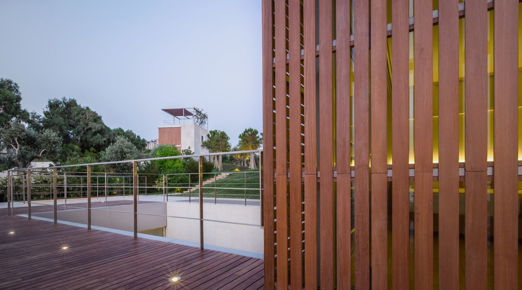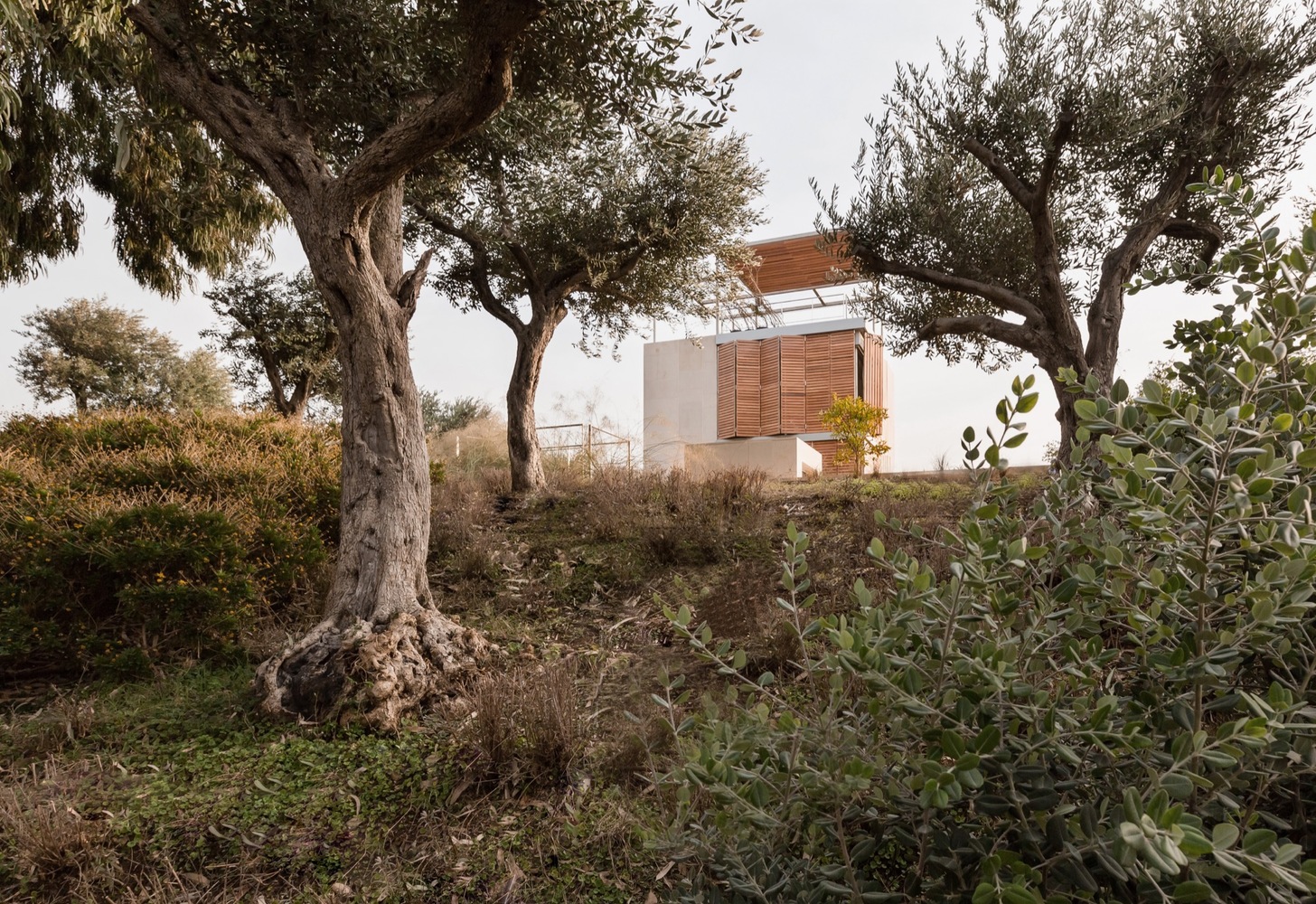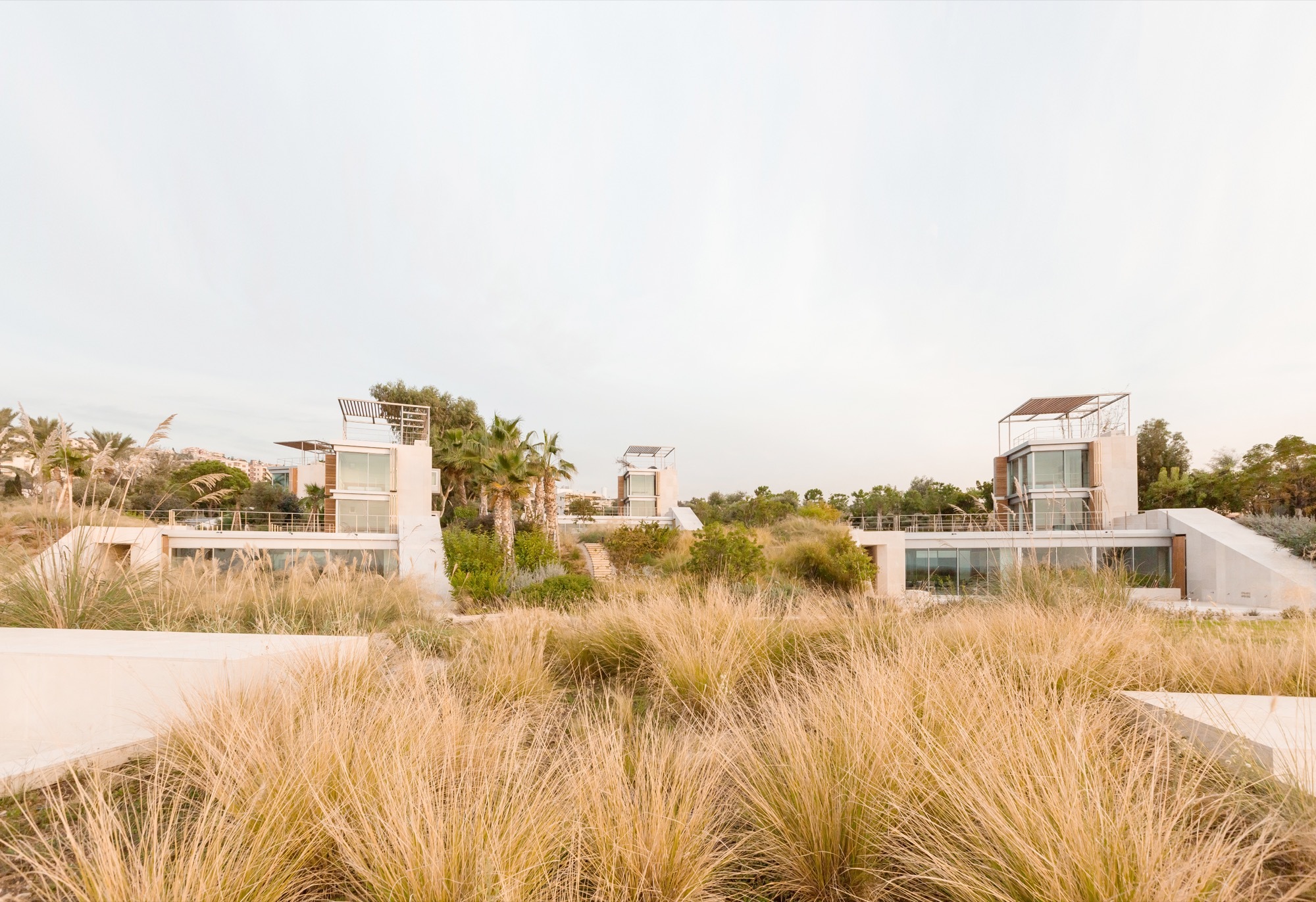 La stratégie concernant l’organisation du paysage réside dans le lien entre plage et montagne. En effet, la mer est visible du terrain. La transition entre terre et mer semblait donc évidente. Ceci a été réalisé par le sol, les plantes et les arbres associés (fougères, mauvaises herbes, fleurs et olives). Avec la conception de la couverture au sol, le plan du site relance l’ancienne route d’eucalyptus comme colonne vertébrale piétonne pour les maisons. De plus, des arbustes sont plantés pour améliorer l’expérience de l’approche de la mer. En somme, c’est un projet où architecture et nature se répondent.