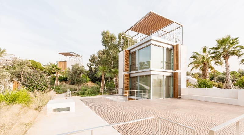 Le projet Courtowers de l’agence Hashim Sarkis Studios comprend quatre maisons construites sur la côte d’Amchit, au Liban. Le cahier des charges de ce projet était de réhabiliter des maisons anciennes dans un paysage existant. Chaque maison a été construite avec un mur double pour retenir la terre du terrain. En effet, l’emplacement en pente nécessitait d’effectuer certaines mesures. Or, cette particularité pentue a permis de dégager la vue de chaque maison. De plus, l’isolation de ces habitations a été pensé pour le climat local. C’est pour cette raison que le sol aspire l’air frais et le diffuse ensuite à l’intérieur de la maison.