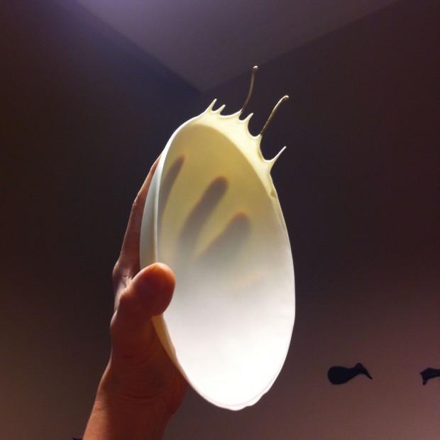 Lors de la préhension de l’objet dans notre main, nous agissons comme celui qui réceptionne ce bol en plein vol avec ses éclaboussures figées. Cet objet artisanal met en scène son utilisateur de manière poétique. Nous pouvons alors nous poser la question de savoir s’il s’agit d’une oeuvre d’art à part entière ou s’il est possible d’utiliser cet objet fonctionnellement. Poésie formelle et douceur représentent le travail d’Aylin Bilgiç.