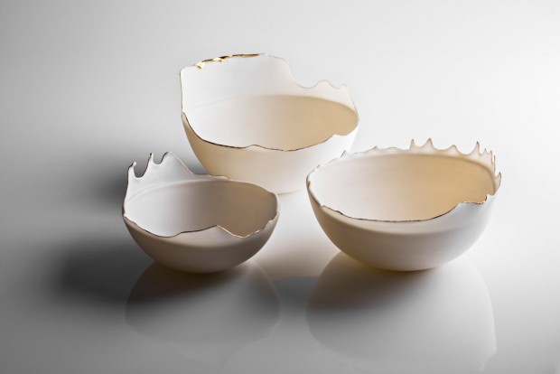Certaines éclaboussures sont ensuite doublées d’or pour ajouter une touche d’élégance. Cette artiste turque marie avec beaucoup de poésie l’instant d’éclat d’un mouvement vif et le matériau rigide. Étrangement, nous retrouvons de la légèreté dans cette collection assez vive. Ces bols rassemblent un éclat de liquide qui ont gelé dans le temps en restant statique. Chaque bol est en porcelaine. L’objet est ensuite fini par trempage de la jante en or pour ajouter un accent élégant. Bien que l’artiste crée aussi assiettes et tasses, ces bols sont assez représentatifs de son travail de céramiste.