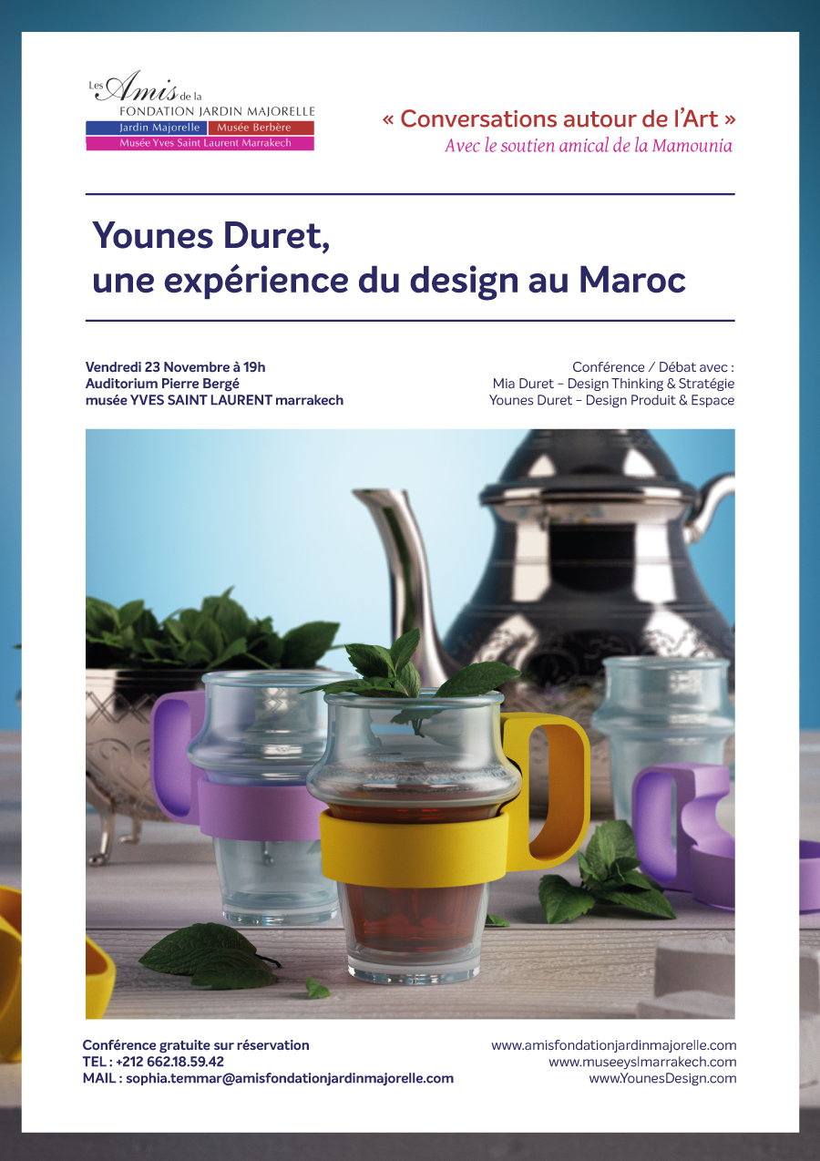 Ingénieur en design industriel diplômé avec les félicitations du jury de la prestigieuse ENSCI-Les Ateliers* de Paris, Younes Duret est un designer marocain maîtrisant les aspects du design dans sa globalité (produit, graphisme, architecture intérieure…) et les contraintes industrielles liées à la production en série. Dès le début de sa carrière, son travail de création s’est orienté vers un concept innovant d’interculturalité dont il est lui-même en quelque sorte le “produit”. Portant depuis toujours un double regard sur son époque à la lumière des valeurs qu’il s’est forgé en confrontant celles de ses deux pays d’origine avec la réalité du monde et son expérience de la vie, il envisage le design comme une recherche fondée sur l’apprentissage par l’autre et l’ailleurs. A travers cette démarche, il cherche aussi à définir une nouvelle esthétique du monde arabe. S’insurgeant non sans humour contre tout ce qui est figé, sa méthodologie est faite d’observations des codes du quotidien et de remises en question des évidences qu’il réinterprète pour offrir une nouvelle lecture de la réalité.