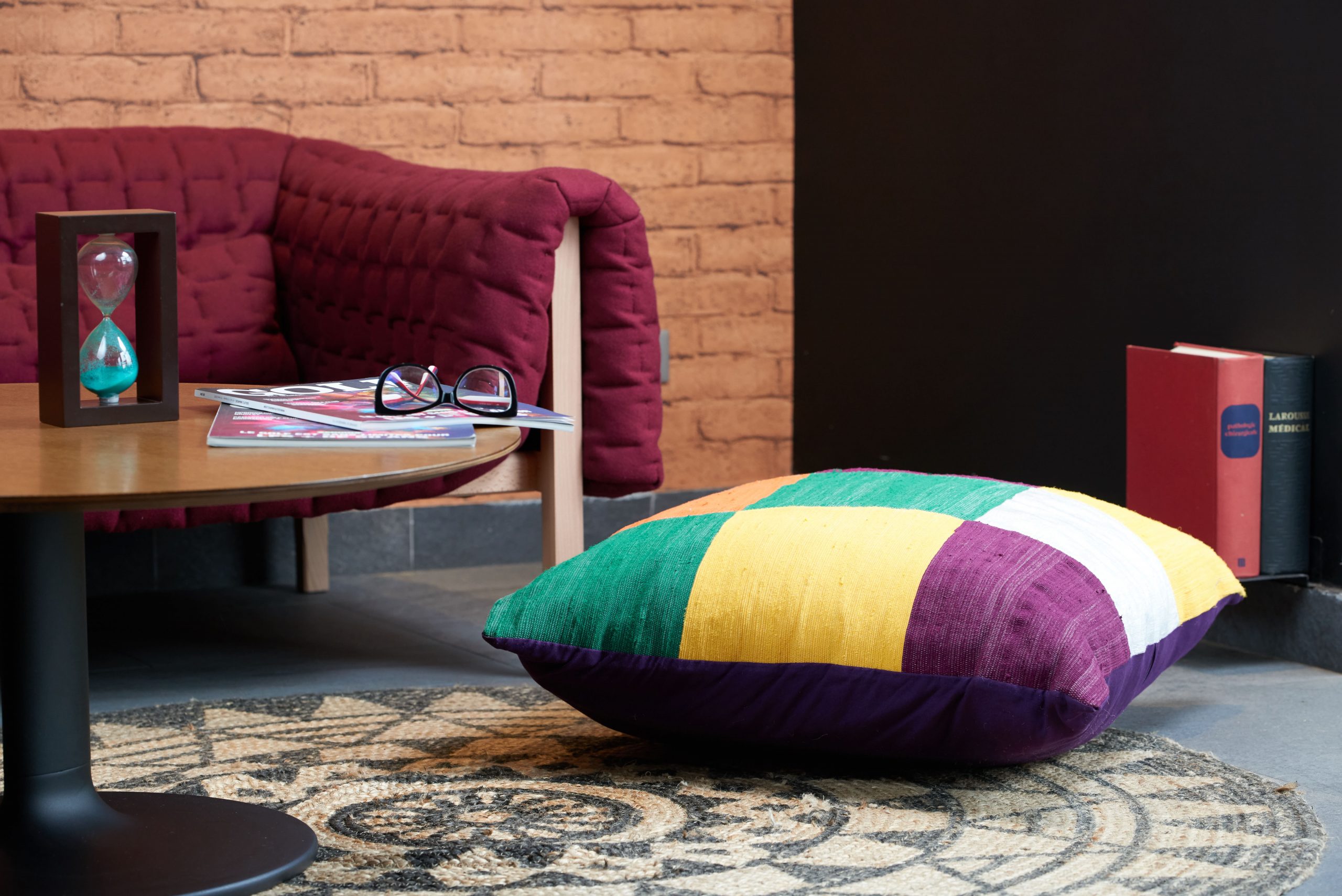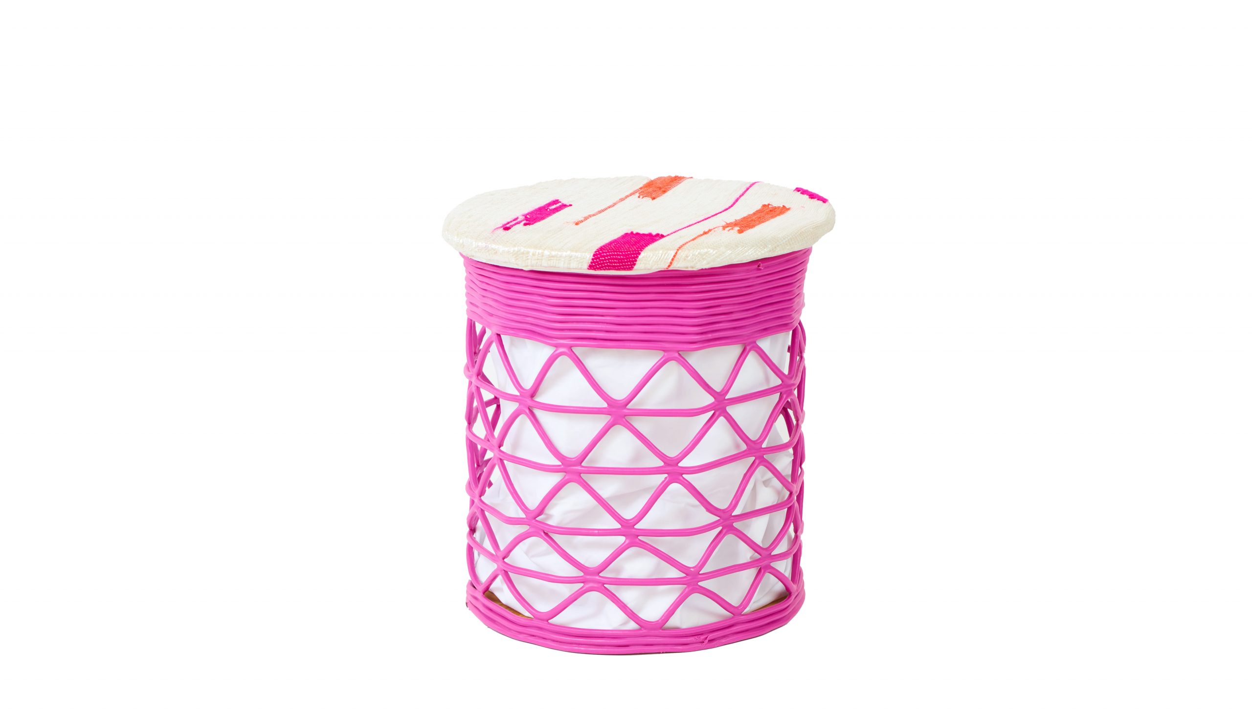 Pouf-pouf est une assise légère toute rose comme un délicieux bonbon acidulé. La corbeille d’assise est fabriquée à partir de bouchons de bouteille récupérés. Le coussin, quant à lui, est tissé avec des sachets en plastique usés.