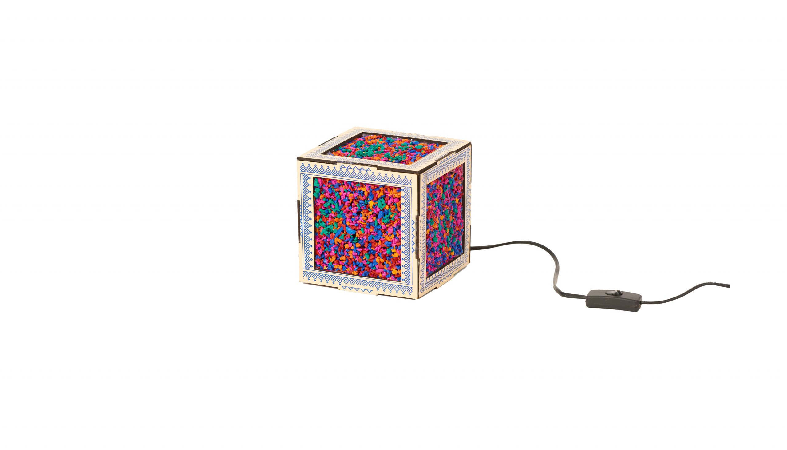 Cette petite lampe à facettes animera les soirées pyjamas de nos chérubins. Des bouchons de plastiques sont d’abord broyés dans des machines adaptées. Ainsi, des tableaux aléatoires et multicolor se dessinent. Puis, des arêtes en bois sérigraphiées au motif traditionnel maintiennent les faces colorées. Lampara, petit cube lumineux, se transporte où bon vous semble.