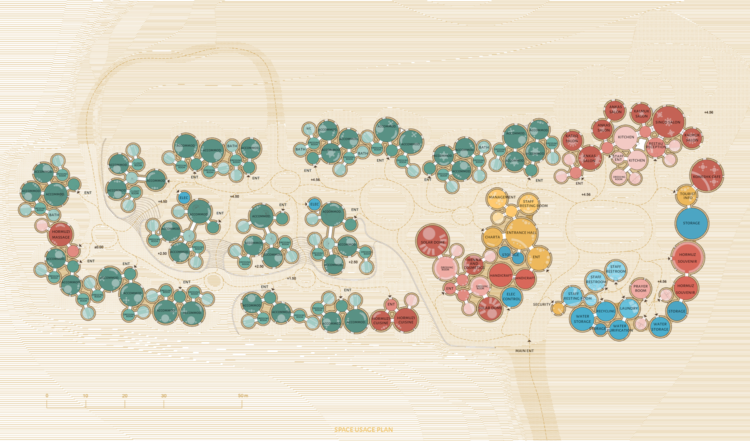 Les formes organiques à taille humaine des résidences Majara, similaires à celles de l’observatoire du désert d’Esfahk, sont assorties au paysage montagneux de l’île de Hormuz. Ses couleurs rappellent les tons de la terre, du ciel, de l’ocre, des plantes et des galets. Elles ont l’avantage de se marier à merveille avec la topographie environnante tout en offrant un contraste visuel. Des chemins sinueux, incitant à la promenade, relient les dômes. Cet ensemble de courbes, propices à l’évasion et la contemplation du paysage, pousse les visiteurs à ralentir et flâner sur l’île.
