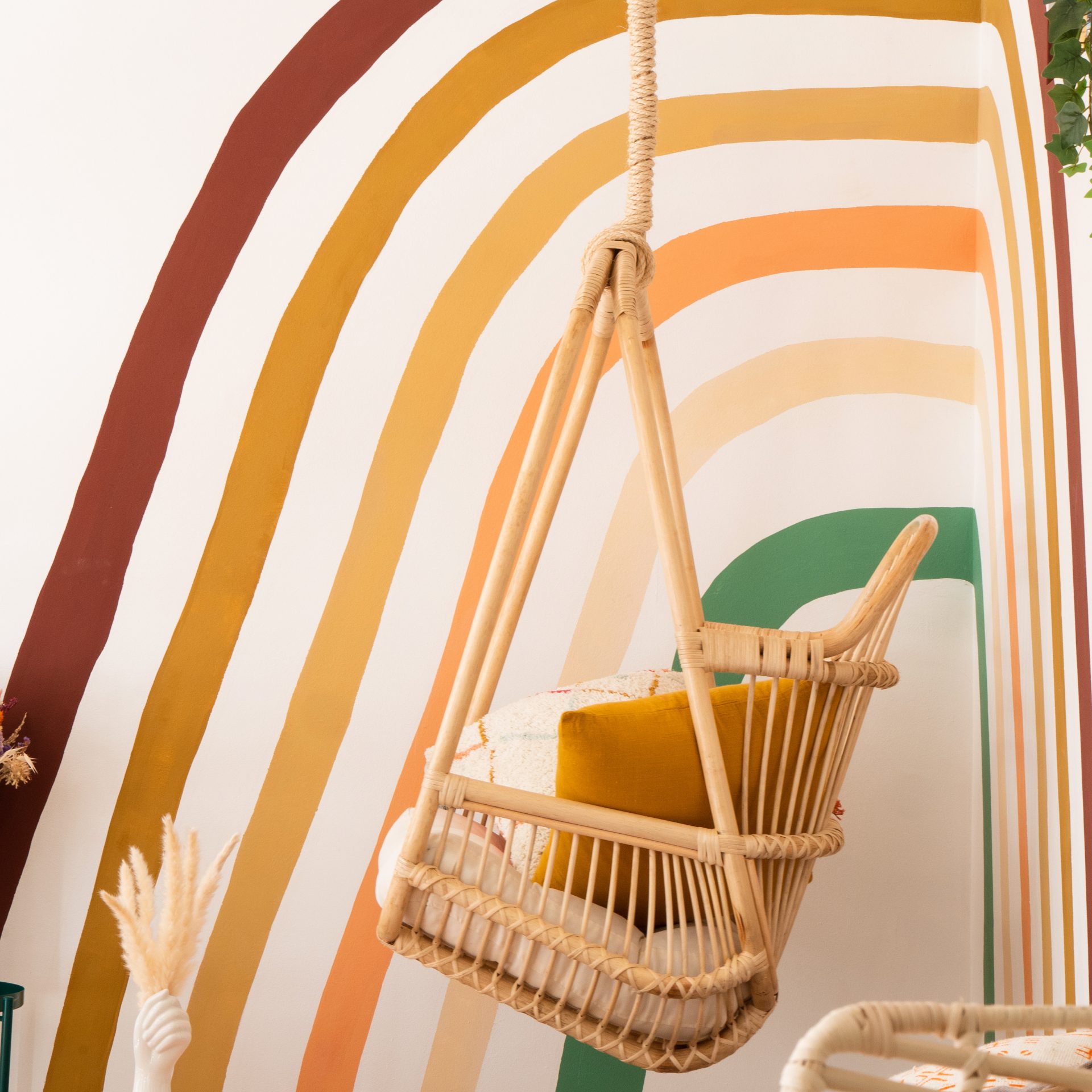 Le cadre entièrement habillé de meubles hand-made et parfumé de compositions florales envoûtantes de chez « The bloom room Marrakech », dégage un bien-être sans pareil et une ambiance cosy. Une échelle en bois accrochée au plafond, rajoute un brin de folie au lieu et anime l’espace par des plantes suspendues, en clin d’œil à la nature, subtilement rappelé par la couleur verdoyante du mur, et du carrelage « Sara Cérame » de la salle d’eau. De plus, le dessin mural réalisé par « Zairab.art » enjolive la pièce par ses lignes courbées et colorées, traitant l’angle délicatement, et épousant le style des chaises curvilignes. Conçues par le soin d’un artisan Rbati au niveau de l’Oulja à Salé, elles associent des dégradés de bois neutre et cohabitent parfaitement avec la décoration.