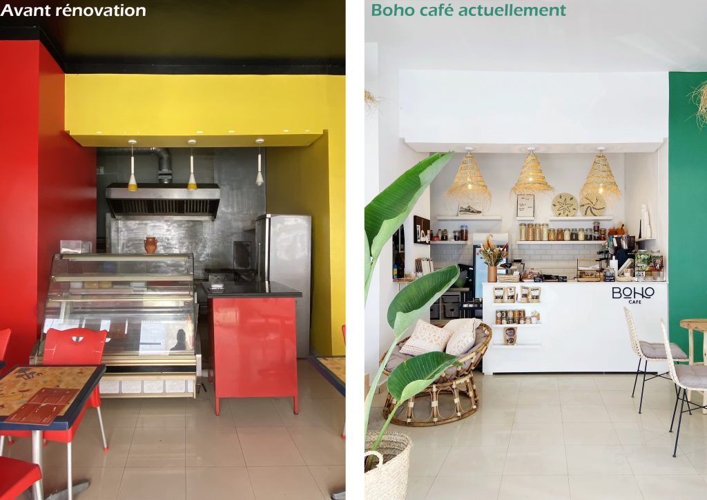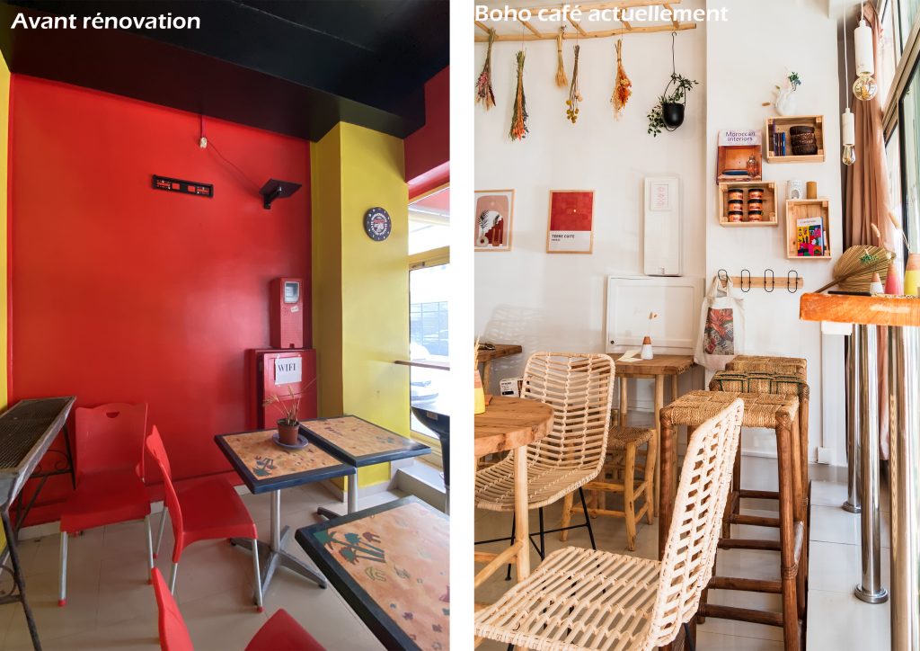 S.O // Honnêtement, ce lieu est le premier local que j’ai visité et dont je suis tombée directement sous le charme. Ce qui m’a le plus attiré était la baie vitrée. J’imaginais déjà les clients siroter leur chocolat chaud, en regardant la pluie tomber en hiver. Certes, il y avait plusieurs changements à opérer vu la succession de fonctions qu’a connu le cadre. Avant d’enfiler la casquette de Boho café, ce fut auparavant un restaurant syrien devenu par la suite un snack. Les couches de peinture successives découverte durant les travaux, ont témoigné de styles décoratifs différents et enchainés.