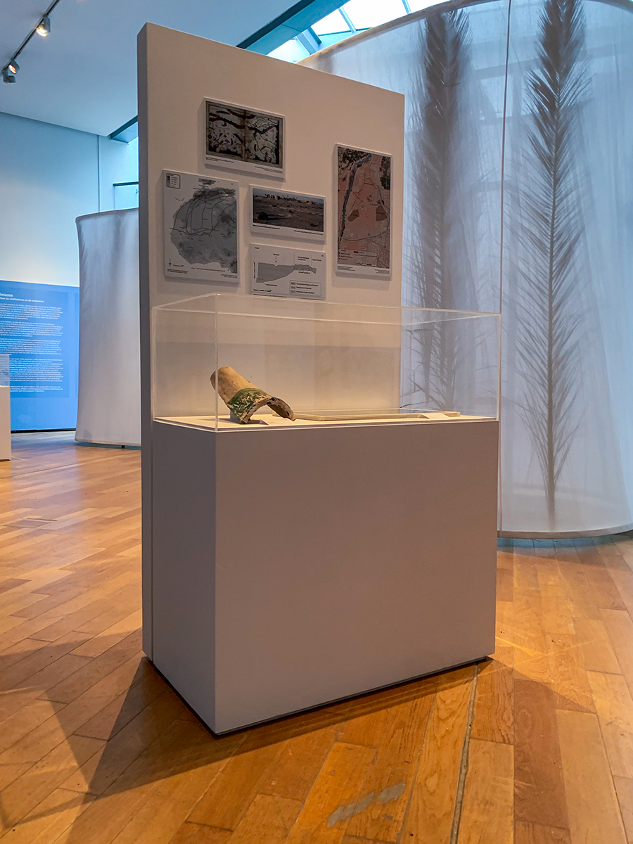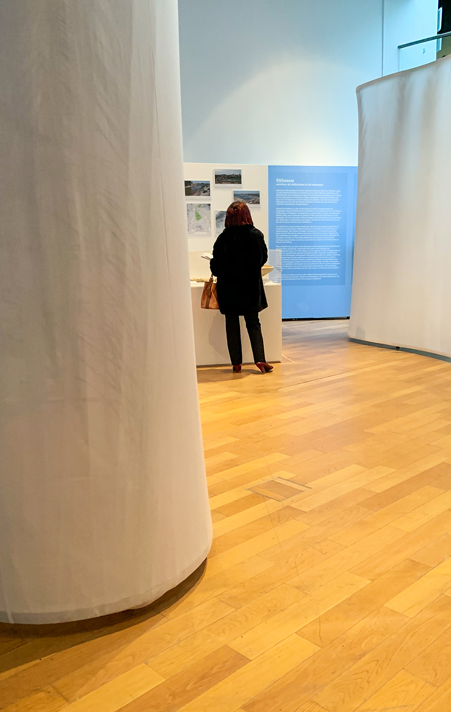 Dans ce lieu, on avance, on recule, on tourne en rond, on rebrousse chemin… on prend le temps de le parcourir. On déambule à proximité d’éléments monumentaux aux parois de toile tendue qui représentent ce voile de l’inconnu à travers lequel le visiteur peut percevoir son histoire encore floue. Ces éléments aux formes courbes apaisent le visiteur, le ralentissent et attisent sa curiosité. Les doux galbes des parois de toile tendue contrastent avec les éléments droits des murs et des présentoirs d’objets.