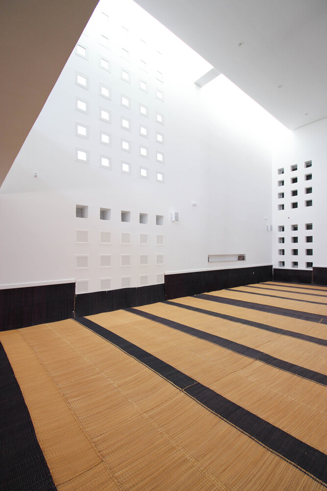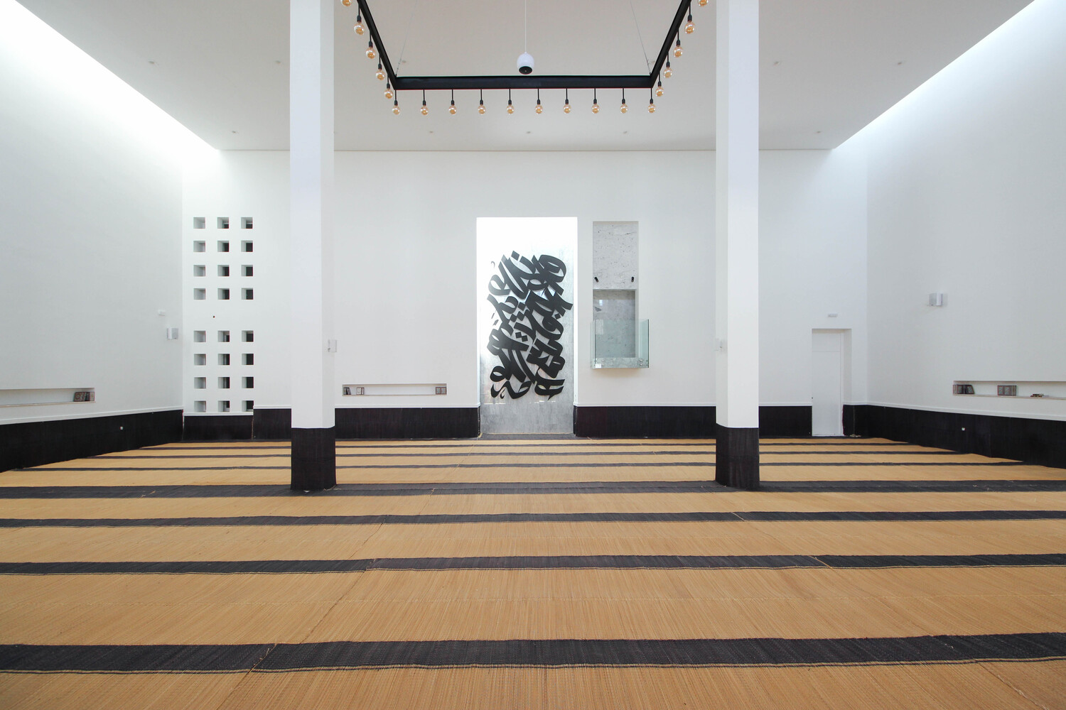 À l’intérieur, on constate de nouveau le dépouillement et le minimalisme de la mosquée Al-Tasamoh, avec encore une fois des murs peints de blanc. Ils sont néanmoins dotés d’une base noire. Celle-ci renforce la forme carrée que l’on retrouve de nombreuses fois dans cette mosquée. Pas de décoration, comme à l’extérieur. Seulement une inscription calligraphiée sur la paroi du mihrab consistant en un verset coranique. Par ailleurs, la salle de prière ne comporte pas de fenêtres : des ouvertures au plafond l’éclairent naturellement, offrant aux fidèles une belle lumière zénithale. Tous ces détails s’accordent avec la fonction spirituelle de ce bâtiment.