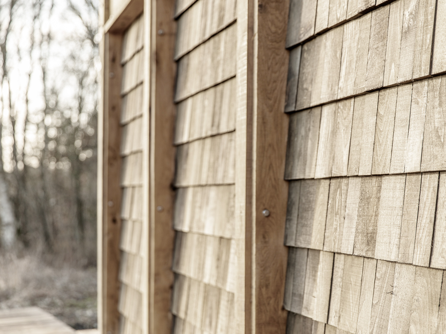 Ce parti-pris résulte en une atmosphère unique, proche de la nature. Pour assortir l’ensemble à cet environnement, des bardeaux d’acacia servent de revêtement extérieur. Quant aux éléments structurels, ils sont apparents. Pour se protéger des inondations, l’ensemble est élevé sur pilotis. Et, pour le confort thermique, l’isolation est en fibre de bois.