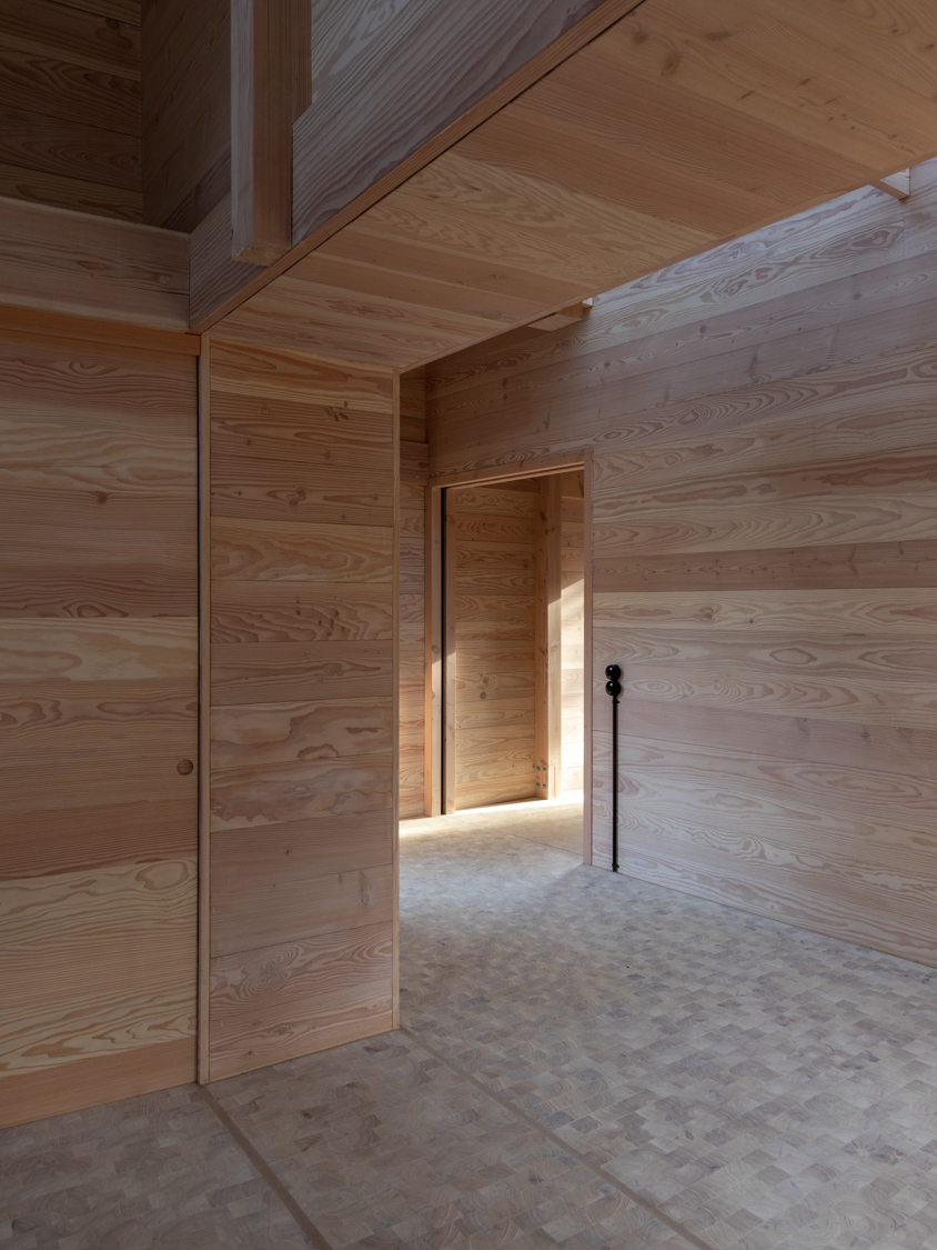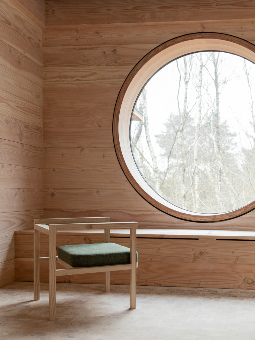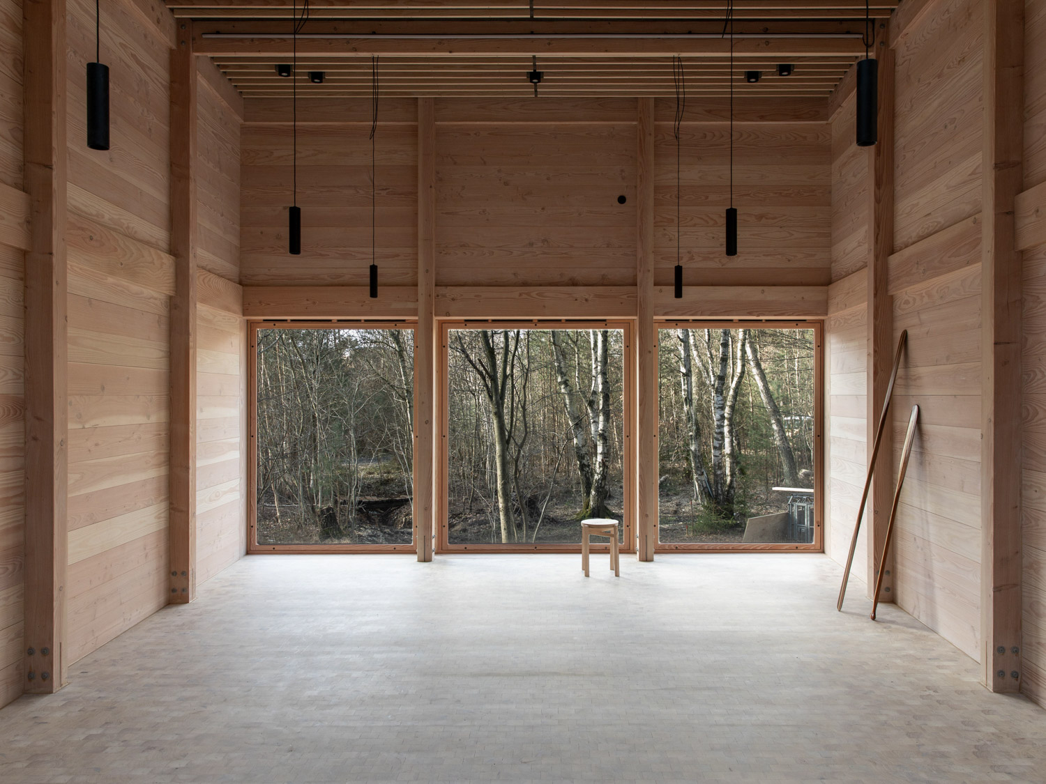 À l’intérieur, on remarque l’omniprésence du bois laissé nu ainsi que des vues imprenables sur la forêt. L’aération se fait par des petites ouvertures au niveau des fenêtres, rendant inutile l’installation de systèmes de ventilation mécanique. De simples suspensions lumineuses noires complètent le lieu et contrastent joliment avec le ton clair du bois. Le tout apparaît visuellement apaisant et promet d’être agréable à vivre.