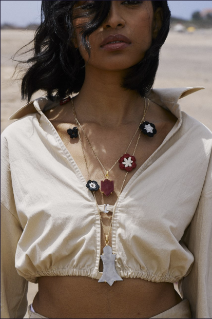 La fusion des deux marques suggère une collection intemporelle revisitée pour créer des sautoirs en plaqué or, chics et bohèmes aux teintes estivales où se mêlent des petites fleurs en macramé réalisées en fil de coton, fabriquées par des brodeuses de Marrakech.