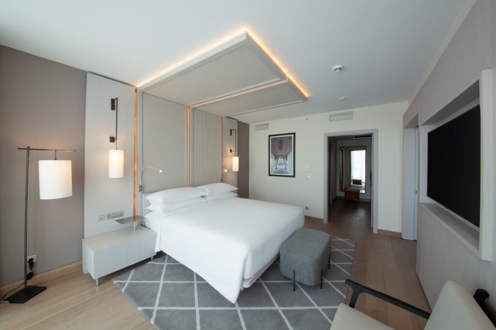 Au lobby high tech fait de matériaux nobles et prestigieux nous imprégnant de l’esprit des lieux, le Rabat Marriott dispose de près de 190 chambres et suites à l’architecture raffinée où luxe et finesse se côtoient. La piscine de l’hôtel à l’ambiance chic et décontractée nous permet une quiétude inégalée. Le mobilier aux lignes épurées aménage l’espace des chambres où un jeu de clair/obscur baigne l’usager dans un confort visuel et ce, grâce à la combinaison entre lumières tamisées et lumière naturelle dans grandes fenêtres.