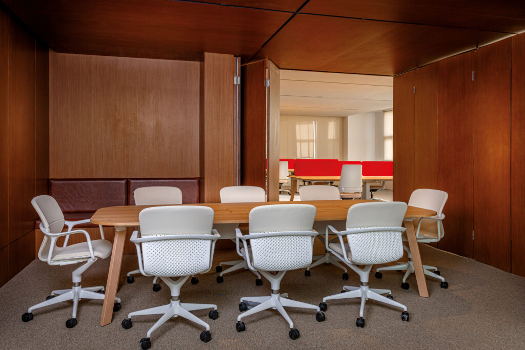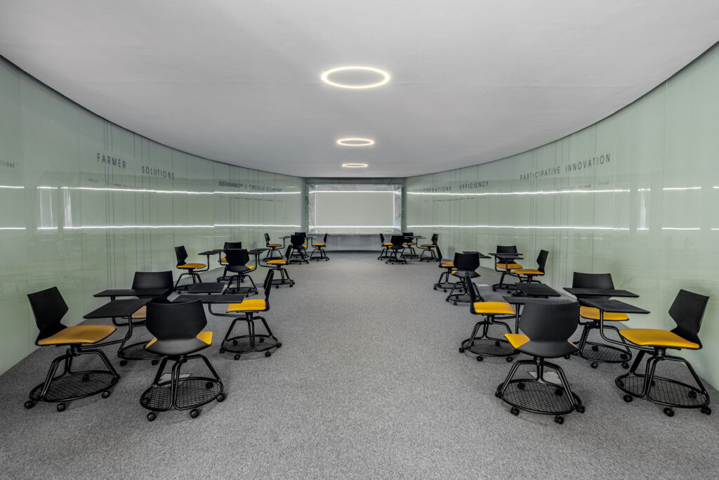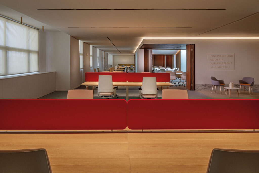 La grande salle de réunion dispose d’une ouverture zénithale agréable, laissant transparaitre les reflets du soleil sur le tableau interactif à grande échelle, mis à disposition des employés pour mieux transcrire leurs idées. Ce tableau, large mur émaillé disposé au centre, se fond parfaitement dans le décor et reflète par sa brillance l’espace de rassemblement. Un dispositif que l’on rencontre plus d’une fois au sein du projet, favorisant le partage et maximisant la concentration, et qui vient s’ajouter aux inscriptions et schémas parsemés sur les murs ou inscrits sur le verre, pour une dose quotidienne de motivation.
