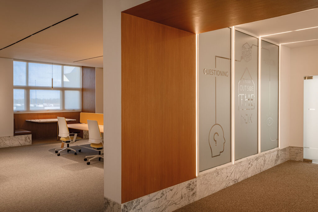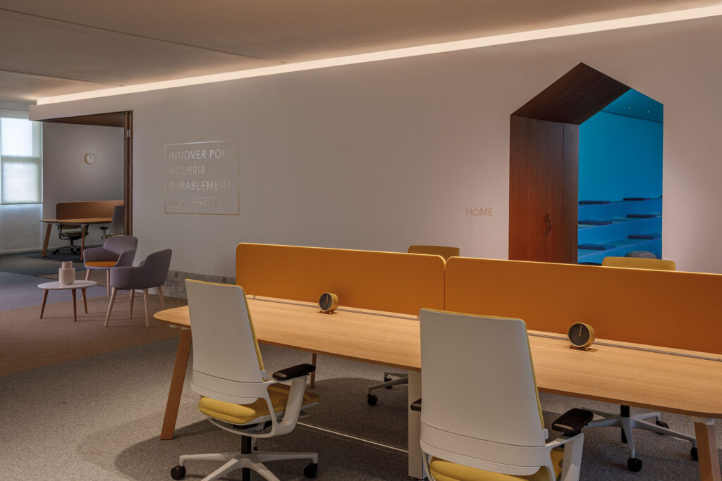 Entre le marbre Arabescato qui longe le bas des cloisons, le bois du revêtement mural, les tons neutres de la peinture, le cuir et les couleurs gaies du mobilier, cet espace de coworking offre une palette conviviale et un patchwork agréable aux employés. Des espaces ouverts, baignés de lumière naturelle, où l’atmosphère rappelle celle d’un chez soi. La composition architecturale contourne les contraintes de structure et les gaines techniques existantes par la création un volume central cloisonné à l’aide de parois amovibles. Des moquettes aux tons neutres recouvrent le sol, changeant de nuances au rythme des fonctions attribuées aux espaces. De subtiles transitions se lisent dans le local, définies non seulement par la couleur, mais également par les percements à l’allure de maisons, les parois modulables et les cloisons en verre fumé.