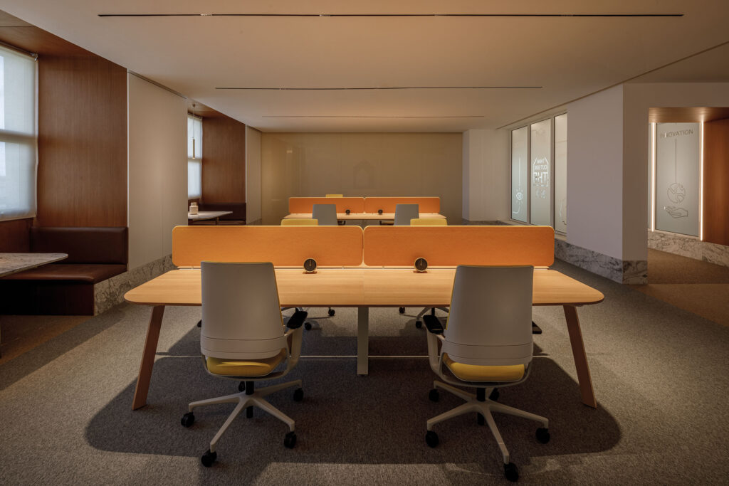 A la base des larges fenêtres tramées, ont été créés des espaces de travail au nombre réduit, avec des tables en marbre et de fines suspensions en laiton. Des espaces situés à proximité des bureaux collectifs, où transparence et ouverture sont les maitres mots. L’ensemble du projet, même en offrant à chaque recoin un univers différent, rejoint et présente le même degré de sobriété dans son intégralité.