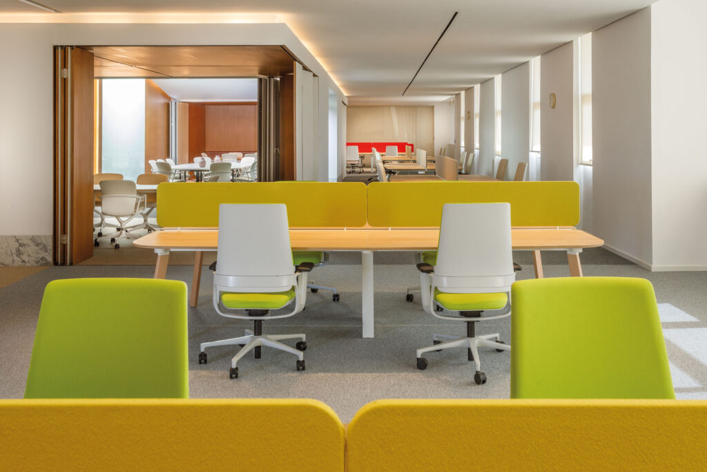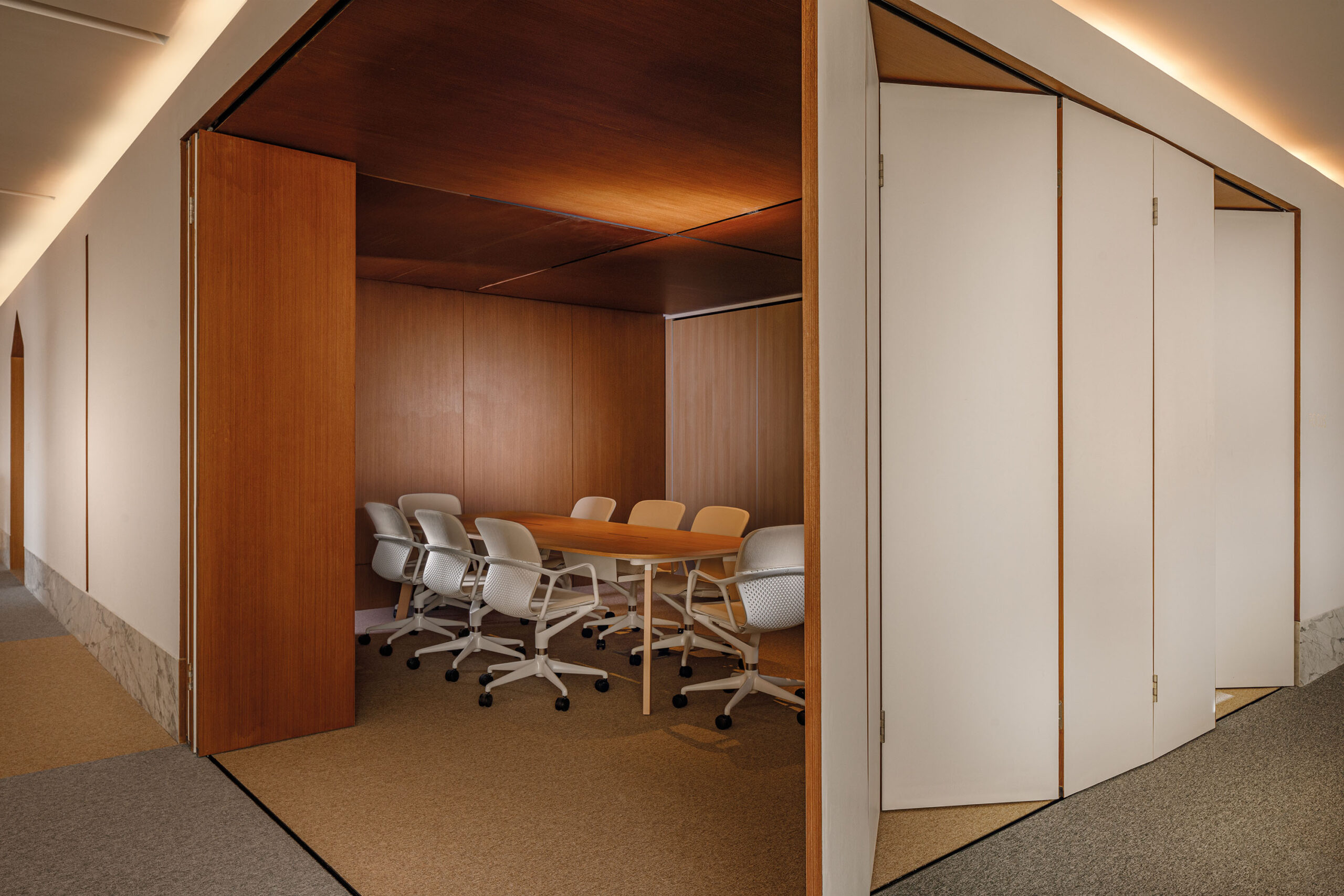 A la base des larges fenêtres tramées, ont été créés des espaces de travail au nombre réduit, avec des tables en marbre et de fines suspensions en laiton. Des espaces situés à proximité des bureaux collectifs, où transparence et ouverture sont les maitres mots. L’ensemble du projet, même en offrant à chaque recoin un univers différent, rejoint et présente le même degré de sobriété dans son intégralité.