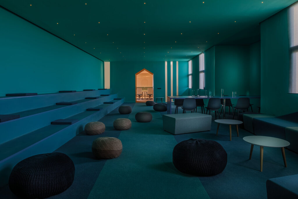 La salle de repos vous plonge directement dans une ambiance détendue, avec ses lumières tamisées, et ses tons bleus apaisants qui contrastent avec les espaces de travails perçus par les fentes finement réparties. Assises, poufs, fauteuils, et gradins, tous aux couleurs dégradées de bleu, sont mises à disposition du personnel pour un moment de détente assuré. Une salle où vous sentirez, des l’entrée, le confort du mobilier et l’énergie positive qui s’en dégage, faisant régénérer toutes les idées des longues journées de travail acharné.