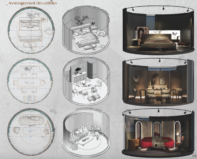 Faisant suite à une longue réflexion sur le sujet des chantiers au Maroc, ce projet répond à la problématique d’améliorer la qualité de vie des ouvriers de chantier. A travers ce PFE, Inass Bagioli crée, comme son nom l’indique, une base vie de chantier modulaire et ce, en créant une structure écologique et abordable pour tout un chacun.