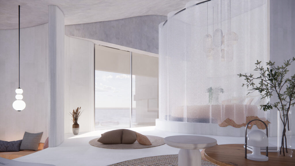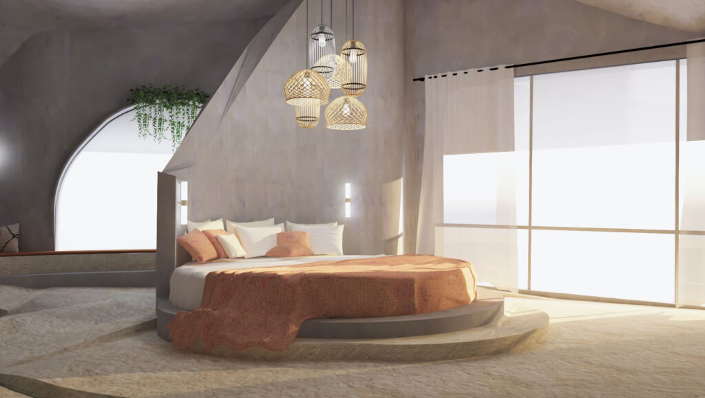 En s’inspirant de la carapace des tortues du milieu naturel rocheux des grottes, Hiba Erraysse réalise une forme d’écolodge qui donne valeur aux formes géométriques de la tortue rappelant ainsi la mer et les courbes des falaises rocheuses.