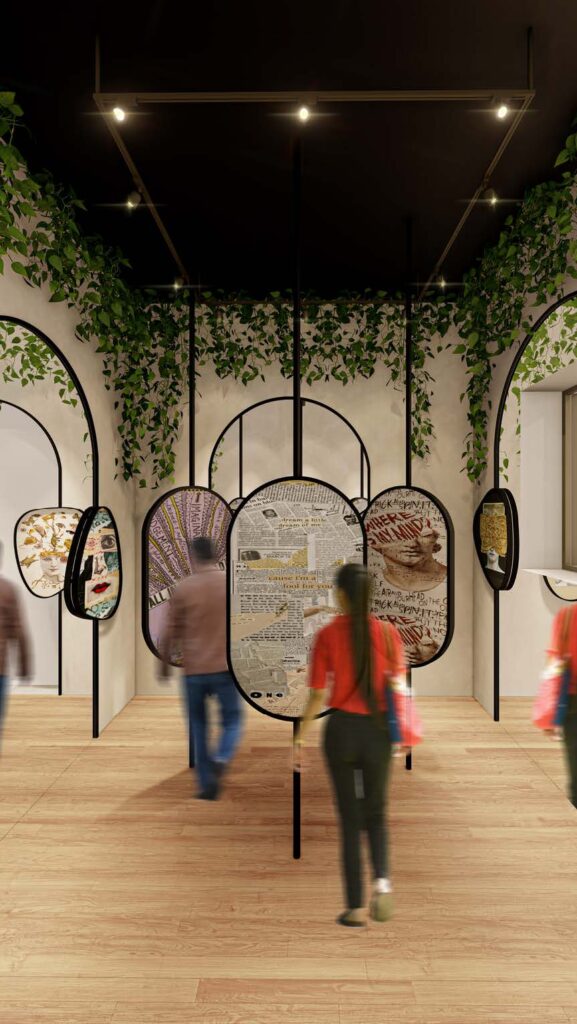La création d’une expérience inédite et spéciale pour l’exposition et pour les ateliers de design d’intérieur est le fil conducteur du processus de création de Ghita El Ouafi et ce, en concevant des cellules à la structure métallique et aux parois rotatives pour délimiter l’espace. L’architecture de ces cellules s’articule autour d’une géométrie circulaire créant un effet théâtral de surprise tout en offrant un niveau d’opulence au bâtiment.