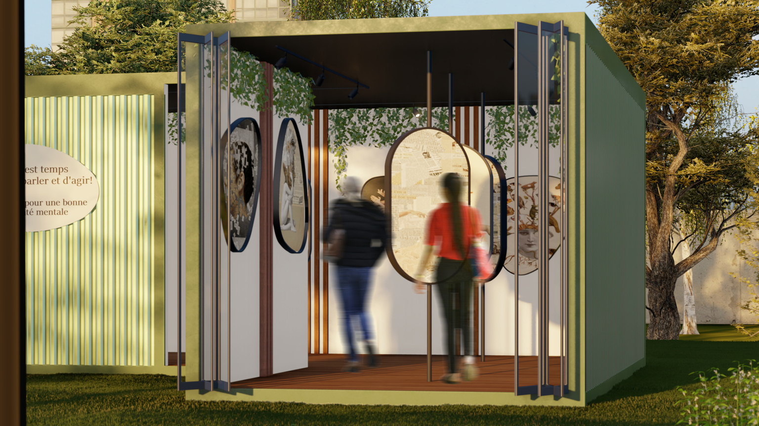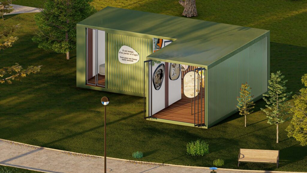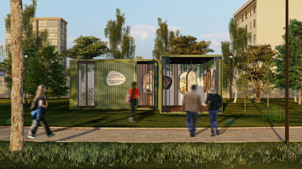 Comme mobilier urbain, Ikram Azizi nous propose une caravane de sensibilisation formée de conteneurs maritimes. A l’intérieur, des expositions de tableaux d’art sur le sujet de la santé mentale y seront prévues. A l’extérieur, une partie évolutive permet de programmer des séances de yoga en plein air ou encore des ateliers de peinture et de dessin.
