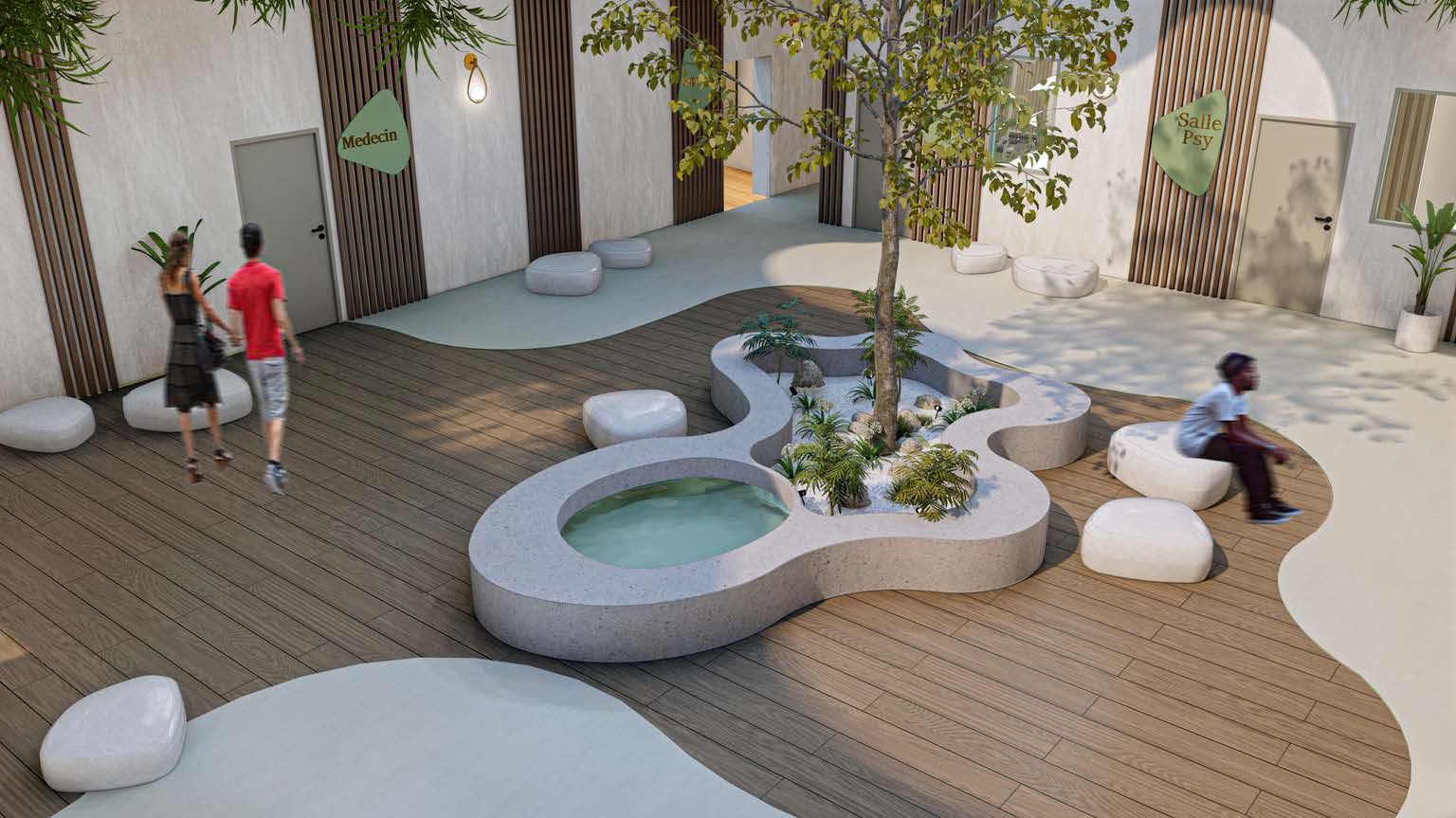En intégrant dame nature dans le processus de conception, Ikram Azizi dispose un patio au centre de l’espace. Véritable puits de lumière et espace de détente, autour de ce dernier s’articule les différents pôles de la structure. Le premier étant dédié à l’information, le second s’intéresse à la production et au divertissement, le troisième lui, est dédié à la réconciliation.