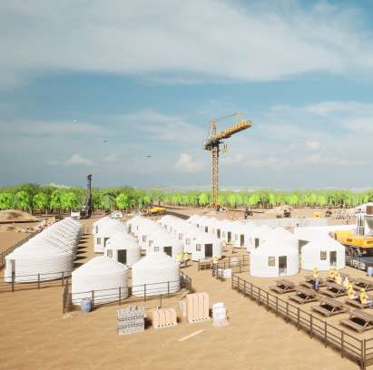 Composée principalement de sacs de toile en polypropylène remplis de terre trouvée sur place, cette structure est fixée par un ensemble de fils de fer barbelés. En créant une structure différente par rapport aux bases de vie des chantiers, Inass Bagioli privilégie l’utilisation de matériaux recyclables et écologiques. Cette dernière est constituée de deux parties essentielles, la première étant permanente, la seconde sera utilisée pour une durée de 5 ans.
