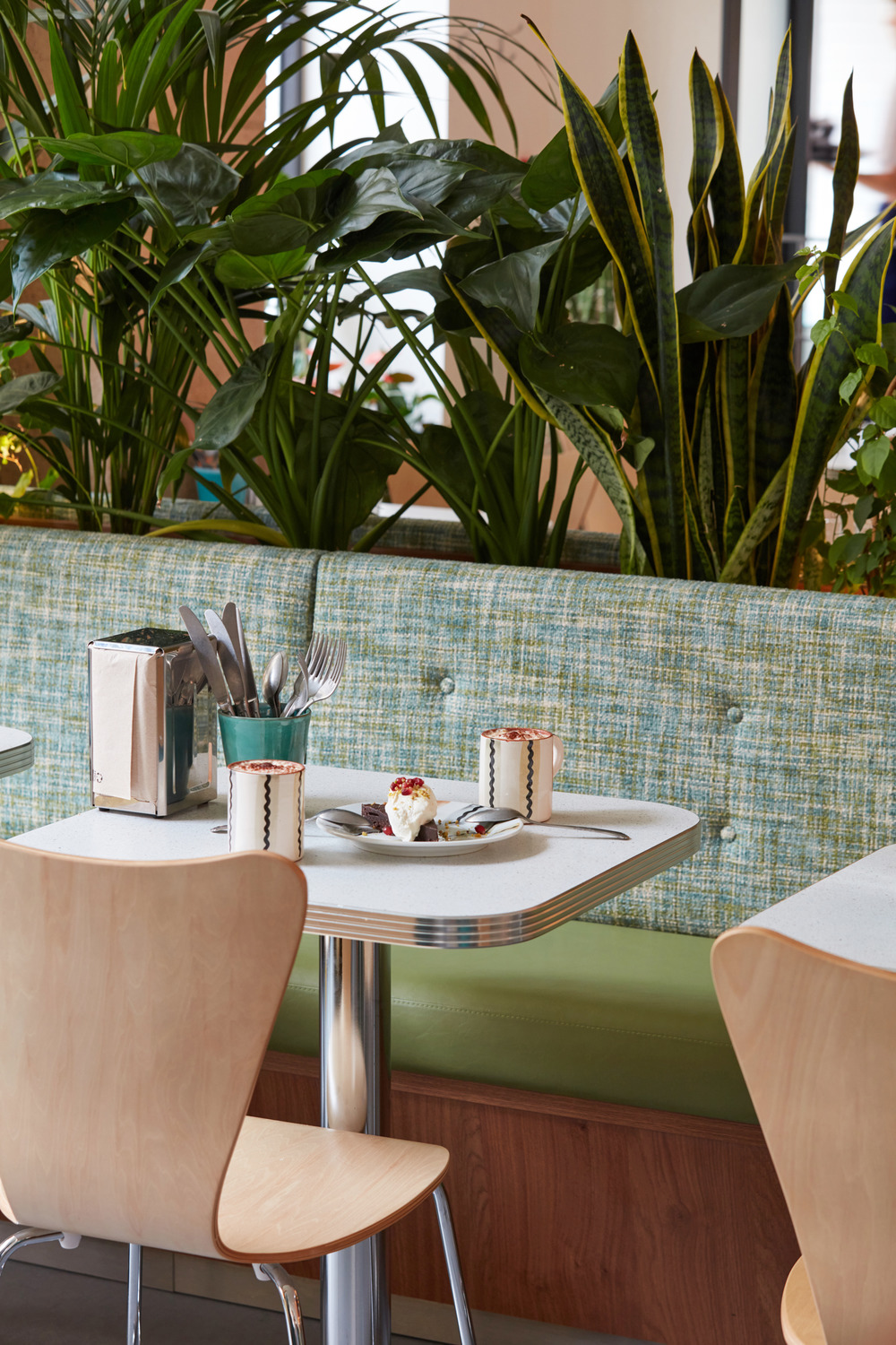 l’essence de la simplicité. Les tables, qui proviennent de magasins américains de fournitures pour restaurants, présentent des plateaux en stratifié, des bandes chromées et des cabines tapissées de vinyle vert lierre, le tout inspiré des couleurs des voitures anciennes, ce qui contribue à l’authenticité de l’espace.