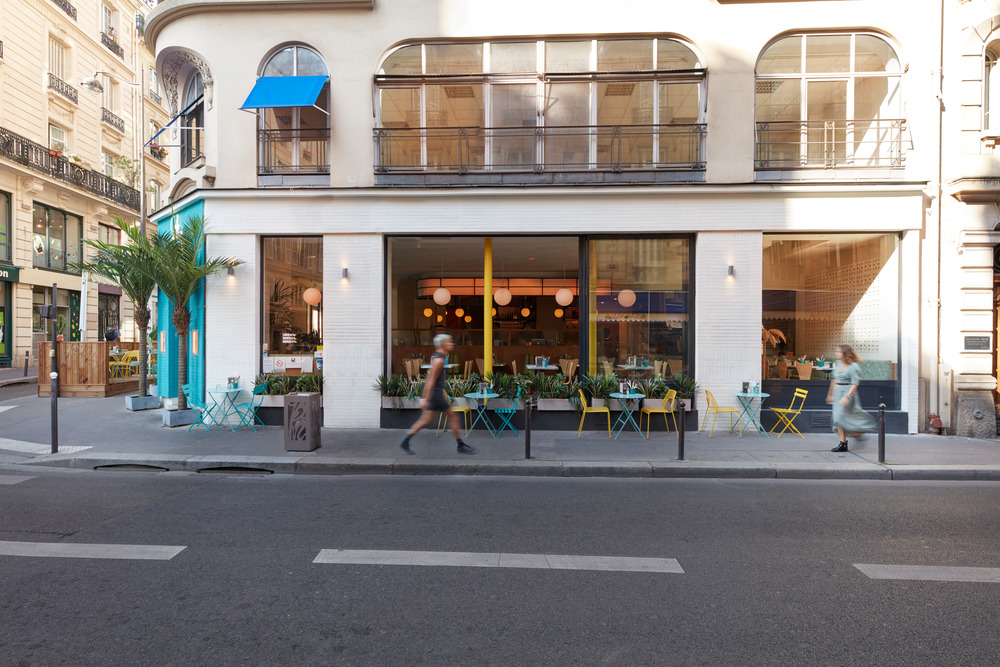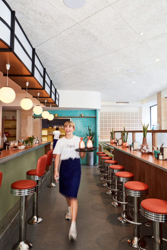 L’extérieur du restaurant se distingue par sa façade en briques, disposées selon un motif géométrique moderniste et peintes d’un blanc éclatant. L’entrée est flanquée de colonnes bleu paon, qui souhaitent la bienvenue dans le quartier parisien. L’architecture intérieure est minimale, les colonnes structurelles du bâtiment étant dénudées pour exposer la maçonnerie pâle, sur laquelle se détachent les couleurs vives des tissus d’ameublement et des accessoires. L’inondation de lumière naturelle provenant de fenêtres allant du sol au plafond et d’une lucarne récemment installée est ponctuée par des pendentifs en verre de différentes tailles placés un peu partout, avec de petits globes décoratifs éclairant le bar et des globes surdimensionnés au-dessus des sièges de la fenêtre. Des motifs inspirés de l’architecture désertique du milieu du siècle dernier sont visibles dans tout l’espace sous la forme d’écrans en parpaings de béton, ainsi que de briques claires de couleur sable reflétant l’extérieur du bâtiment.