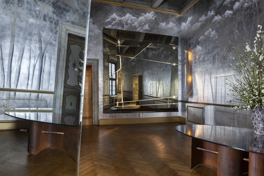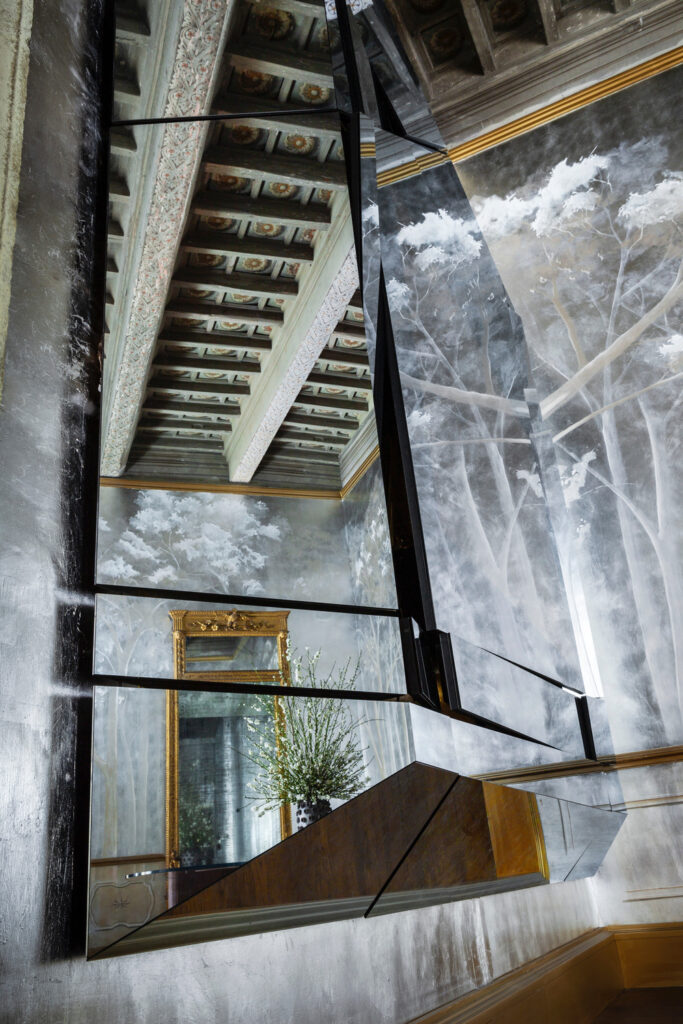 “Comme dans tous nos projets, nous avons travaillé avec une approche sur mesure, en partant des caractéristiques particulières du contexte, pour créer un cadre visant à valoriser un lieu à l’identité forte. Dans la grande salle de 60 mètres carrés, les vides dominent sur les pleins. Les murs, entièrement décorés à la main, représentent une forêt de pins romains peints en blanc sur un fond de feuilles d’argent, comme une sorte de jardin d’hiver virtuel. On a voulu éviter la surabondance et les excès; d’où l’idée d’une installation qui ne soit ni autoritaire ni imposante, mais plutôt moderne et capable de s’intégrer à l’environnement historique. Conçue et réalisée pour dialoguer avec l’intérieur et pour diriger le regard dans l’espace, plutôt que de le capturer” selon Fabio Mazzeo.