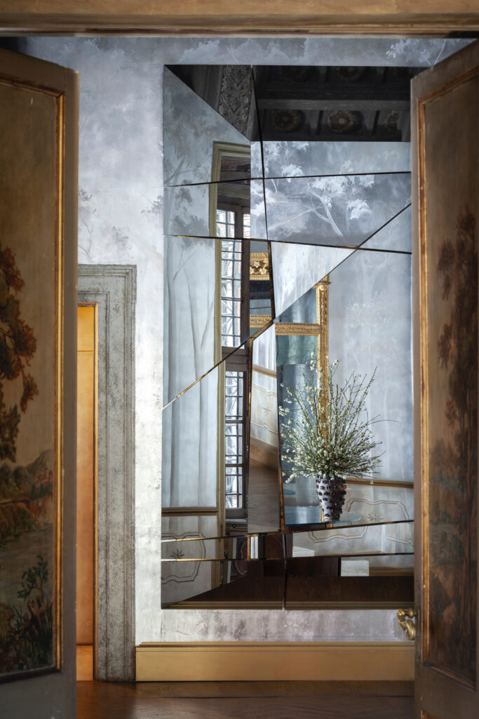 Siège opérationnel de Fabio Mazzeo Architects. Dans le vaste hall d’entrée du palais du XVIIe siècle de via Giulia 167, une nouvelle installation scénique réfléchissante accueille et surprend les hôtes et les visiteurs.