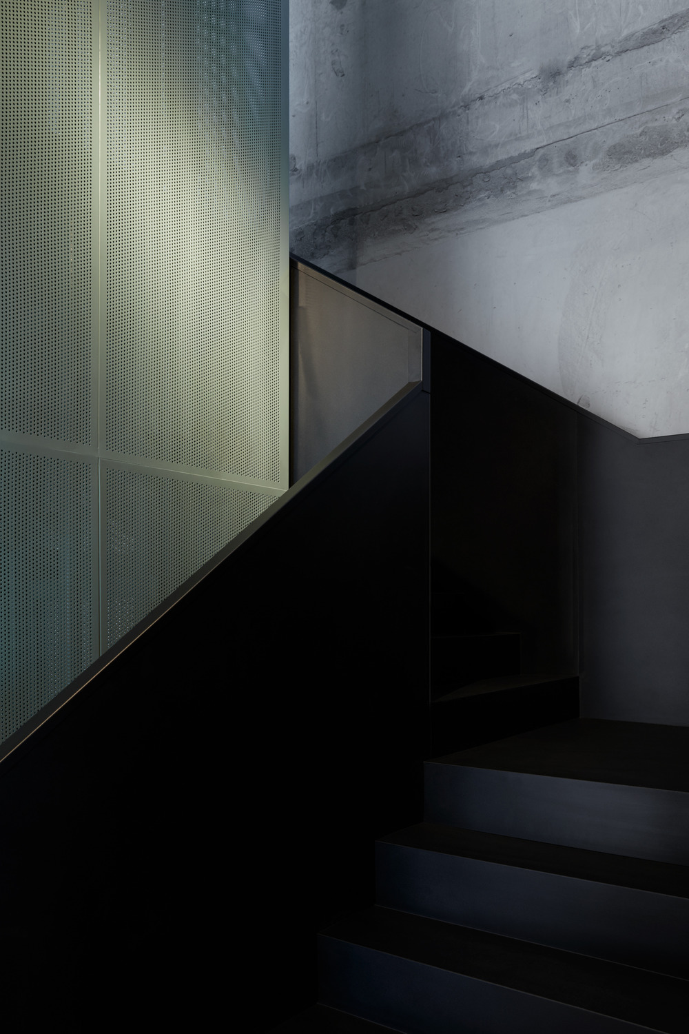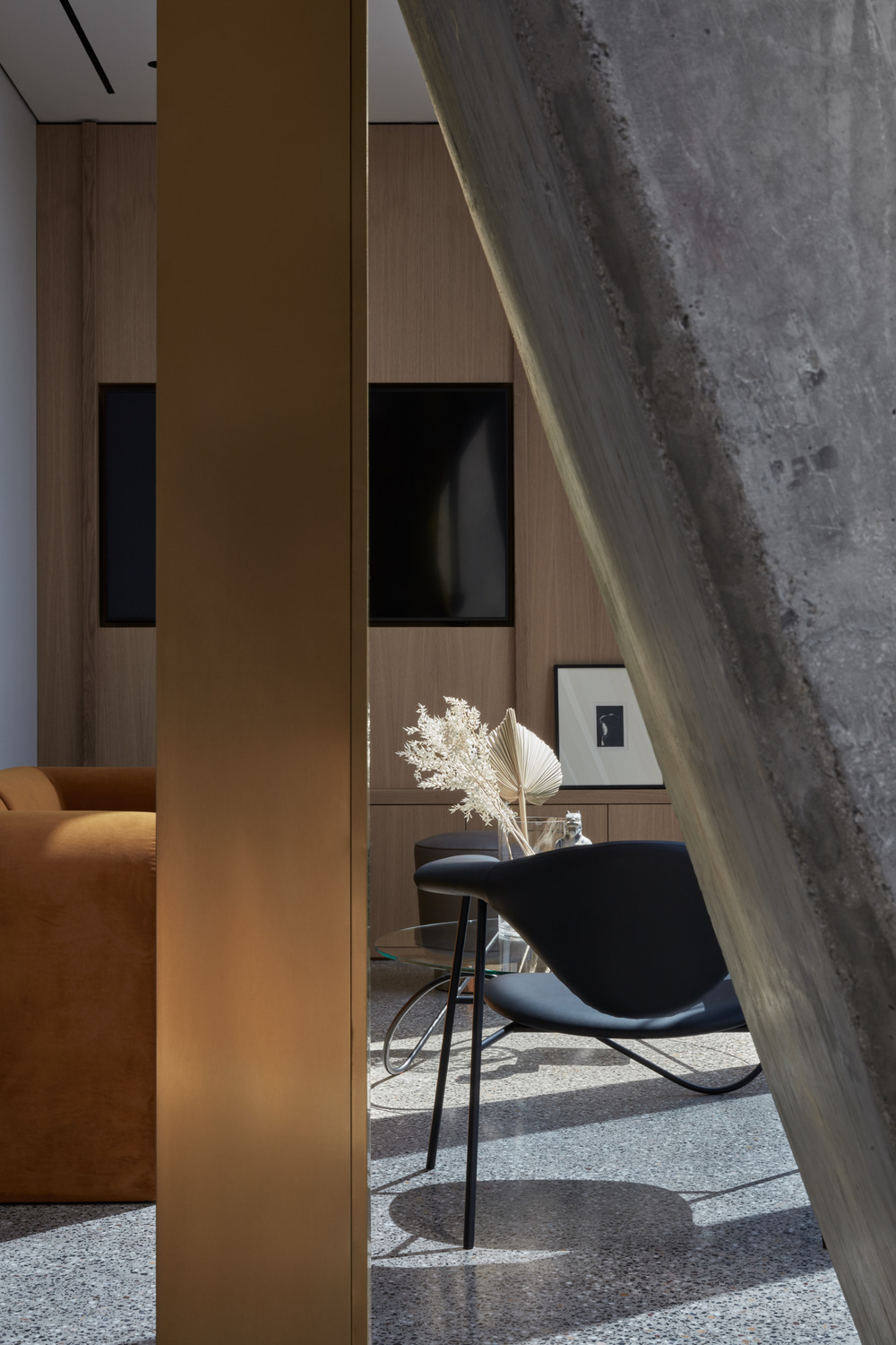 L’utilisation par VSHD de la plupart de la structure originale de l’espace s’aligne sur la philosophie et la manière de travailler du cabinet de design. La plupart des éléments structurels ont été conservés dans leur état brut et imparfait d’origine, notamment les colonnes structurelles en béton et les murs porteurs. Les colonnes inclinées répétées le long du paramètre de l’espace servent de point de départ à la conception – VSHD a veillé à ce qu’elles restent indépendantes, sans aucune fixation. Les colonnes ont ensuite été utilisées comme éléments sculpturaux pour fonder les différents espaces des bureaux de l’entreprise. Le béton a été utilisé comme base, avec un revêtement en laiton brut, du chêne naturel non teinté et un sol en granulats. Le résultat est un espace lié par les lignes, la structure et les matériaux authentiques de l’espace d’origine, mais amélioré par la rénovation, l’utilisation de nouveaux matériaux bruts et un sentiment de collaboration et d’interaction qui unit l’espace.