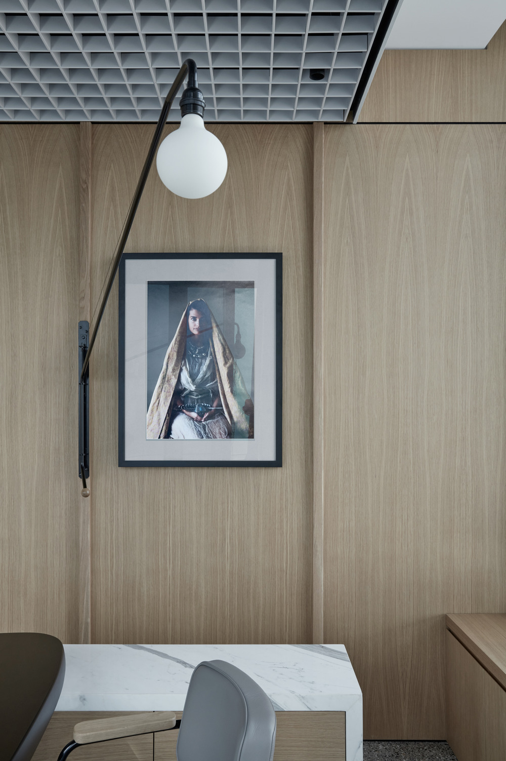 L’utilisation de matériaux de haute qualité et de lumière naturelle est primordiale dans le travail de VSHD. Les tissus utilisés par le cabinet de design dans les bureaux d’Imdad sont axés sur la chaleur, le confort et la résilience, associés aux effets de la lumière naturelle qui traverse les fenêtres. VSHD estime que la lumière naturelle est à la fois un luxe et une nécessité. Dans la conception de ce bureau, l’entreprise a utilisé toutes les fenêtres disponibles, tout en veillant à ce que les ajustements de conception permettent aux zones sans fenêtre de bénéficier également de la lumière naturelle. Lorsque l’éclairage naturel n’était pas possible, des lumières indirectes ont été conçues, dessinées et fabriquées pour permettre un espace de travail confortable, ni trop lumineux ni trop sombre.